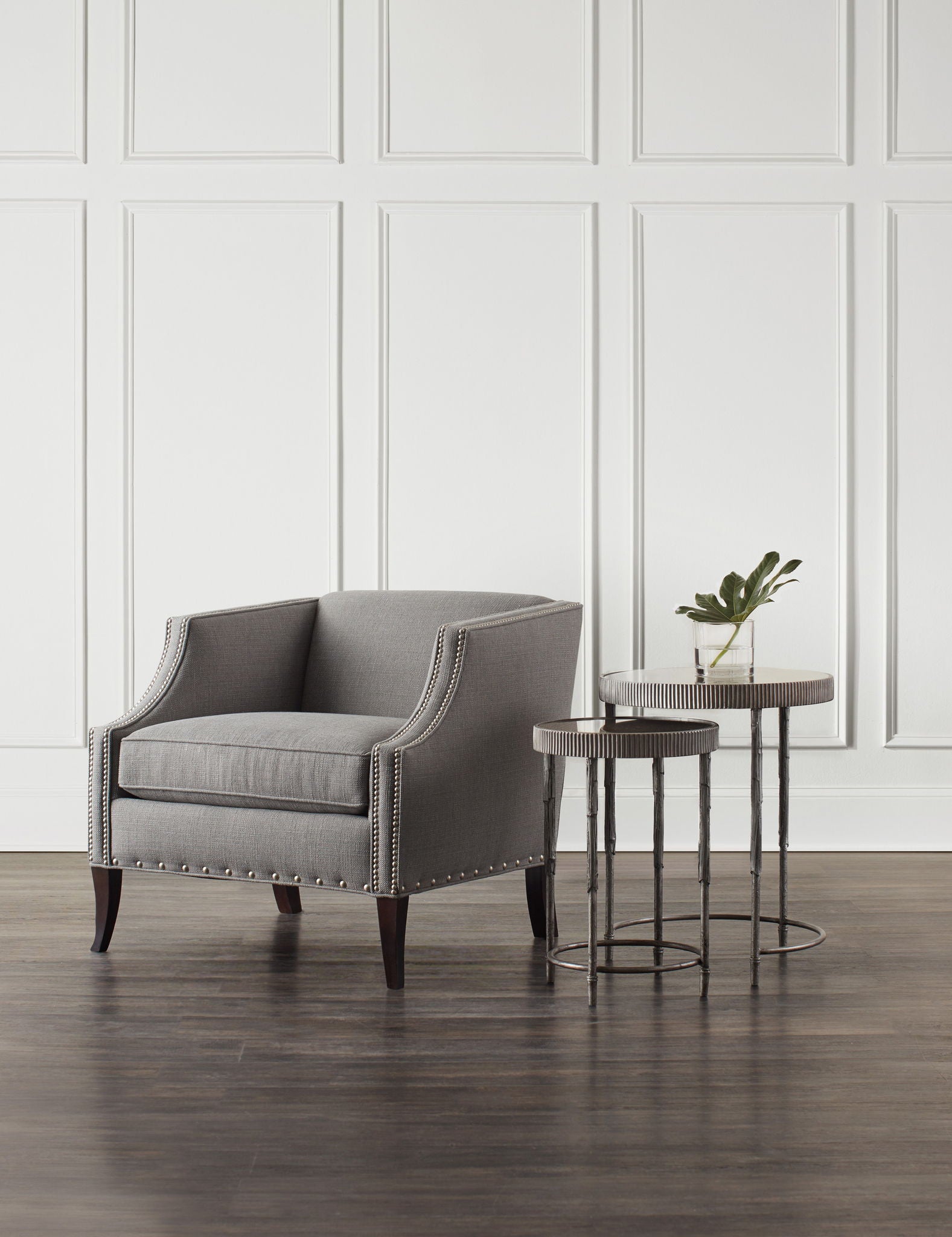 Organic and tactile, these accent nesting tables are rich in texture, crafted of iron and mirror with a silver finish over iron and a mirrored top. Add a glamorous modern twist to any space. The large table measures 19.5 inches in diameter and 24 inches high, while the small table is 14 3/8 inches in diameter by 19 ¾ inches high.