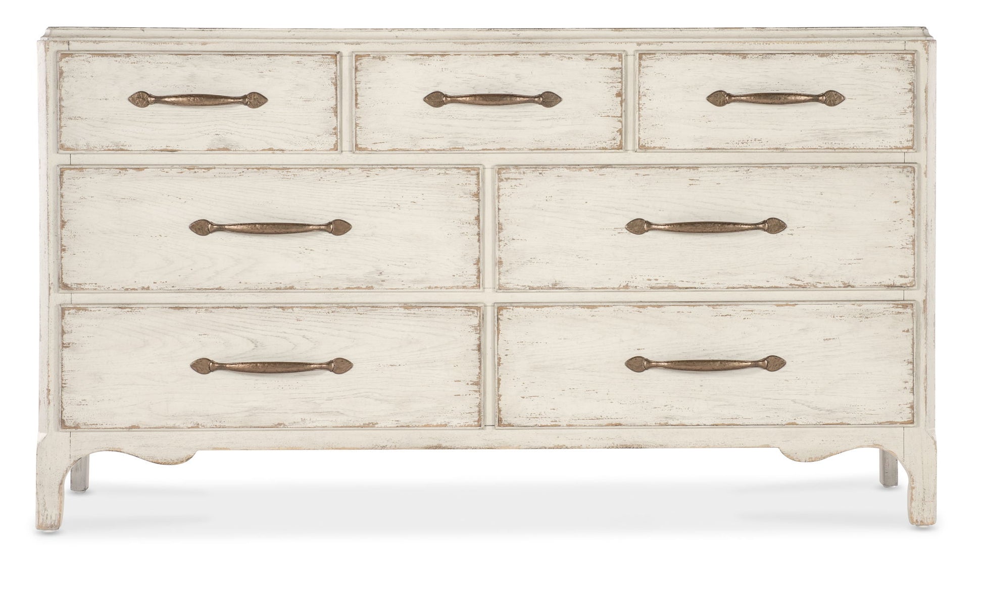 In a classic, charming design with a nostalgic flair, the American Dresser is crafted of Oak Veneers with a Solid-Wood Edge Top, a scalloped-shape base and finished in the deep, dark Molasses finish. There are 7 self-closing drawers, with the top left and right drawers with black removable felt liners. The center drawer has a black liner and black removable jewelry tray. The bottom two drawers are cedar-lined. Metal alloy pulls are in an antique bronze finish.