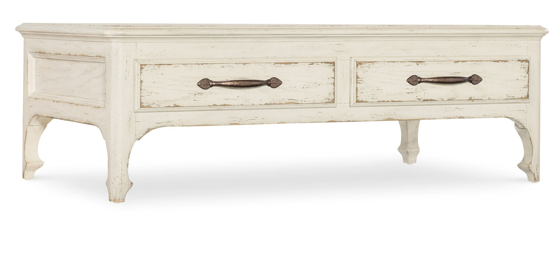 In a classic, charming design with a nostalgic flair, the 58W x 32D rectangle-shaped Americana Cocktail Table has scalloped shaped legs and is finished in the time-worn white Daisy over Cathedral Oak Veneers. The finish represents the natural wear one might expect of pieces passed down through the family over time, revealing the rich oak character beneath. The table has a Solid-Wood Edge top, two self-closing drawers with drawer interiors in the Honey finish and metal alloy bar pulls in an antique bronze finish.