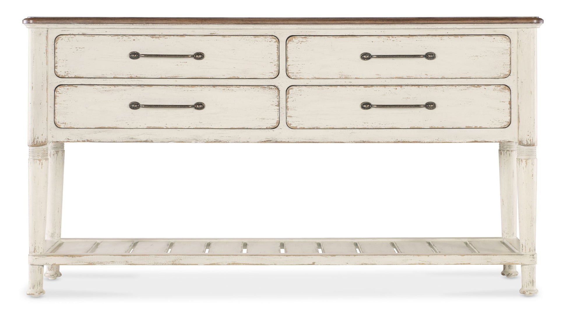 Reimagining a historical design with a fresh take on finish, function and form, the Americana Server has a nostalgic silhouette with details including one fixed plank shelf on the bottom and carved accents on the legs. Crafted in Oak Veneers with a Solid-Wood Edge Top, it is finished in the deep tone on the case with the gentle finish on the top. Featuring 4 self-closing drawers, the top left drawer has removable felt liner and the top right drawer has removable felt-lined silverware tray. The interior finish is Honey.