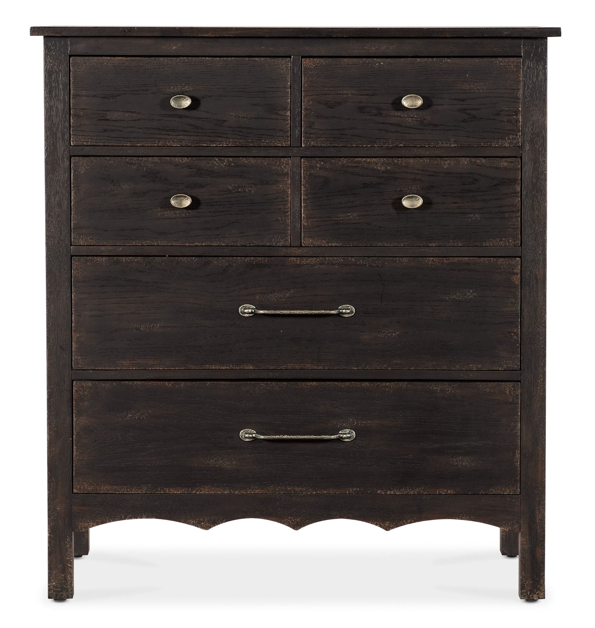 In a classic, charming design with a nostalgic flair, the Americana Six-Drawer Chest is crafted of Oak Veneers with a Solid-Wood Edge Top, a scalloped-shape base and finished in the deep finish. The drawers are self-closing and finished on the interior in the warm color. The top drawers have a removable felt liner and the bottom drawer is cedar-lined. Metal alloy knob pulls have an antique bronze finish.