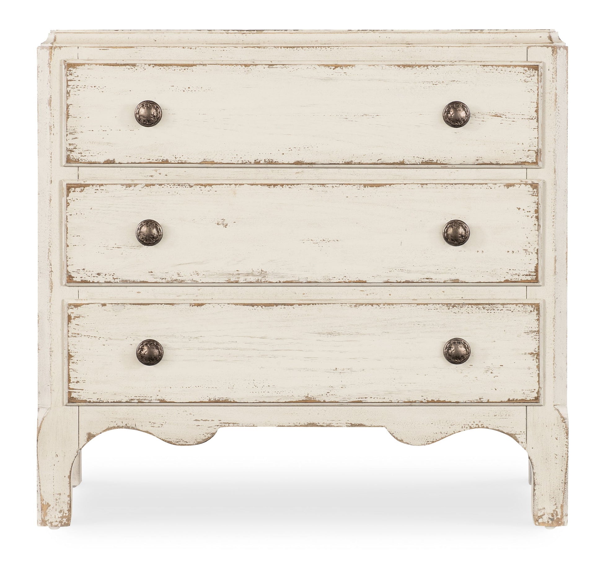 In a classic, charming design with a nostalgic flair, the Americana Three-Drawer Nightstand is crafted of Oak Veneers with a Solid-Wood Edge Top, a scalloped-shape base and finished in the deep tone. There are 3 self-closing drawers, with the interiors finished in the warm color. Metal alloy knob pulls in an antique finish.