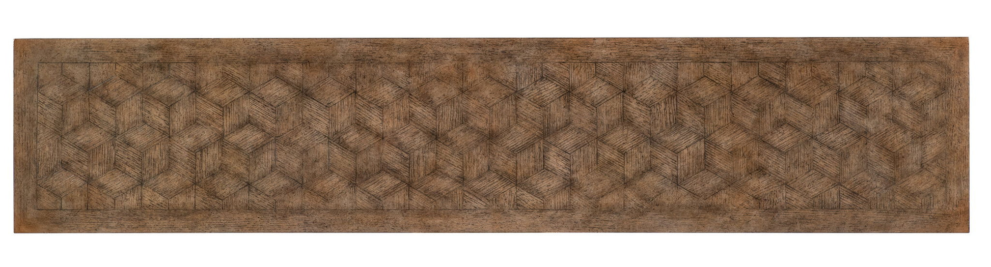 Reimagining an historical design with a fresh take on finish, function and form, the stunning Americana Trestle Console Table has a two-tone finish combining a parquet Oak Veneer top design with a Molasses finish on the base. Capturing the essence of a well-loved heirloom, the deep dark Molasses tone over Cathedral Oak Veneers adds warmth, while the variations in color reveal the natural beauty of the wood beneath. The base is an interlocked carved stretcher design. At only 16 inches deep, this striking piece fits into even tight spaces. Solid-wood edge top.