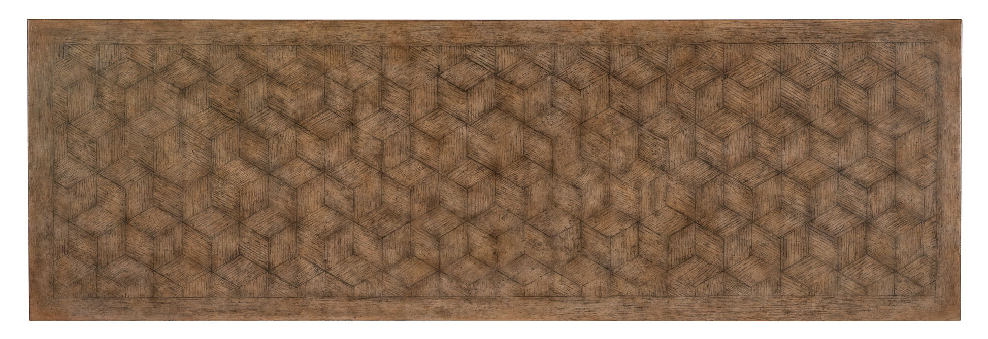 Reimagining an historical design with a fresh take on finish, function and form, the stunning Americana Trestle Cocktail table has a two-tone finish combining a parquet Oak Veneer top design with a Molasses finish on the base. Capturing the essence of a well-loved heirloom, the deep dark Molasses tone over Cathedral Oak Veneers adds warmth, while the variations in color reveal the natural beauty of the wood beneath. The base is an interlocked carved stretcher design. Solid-wood edge top.