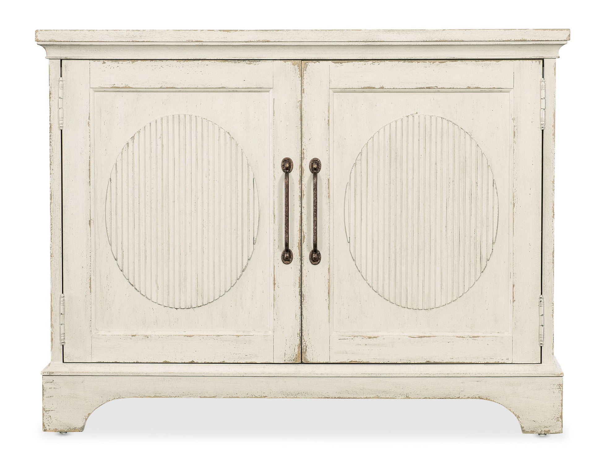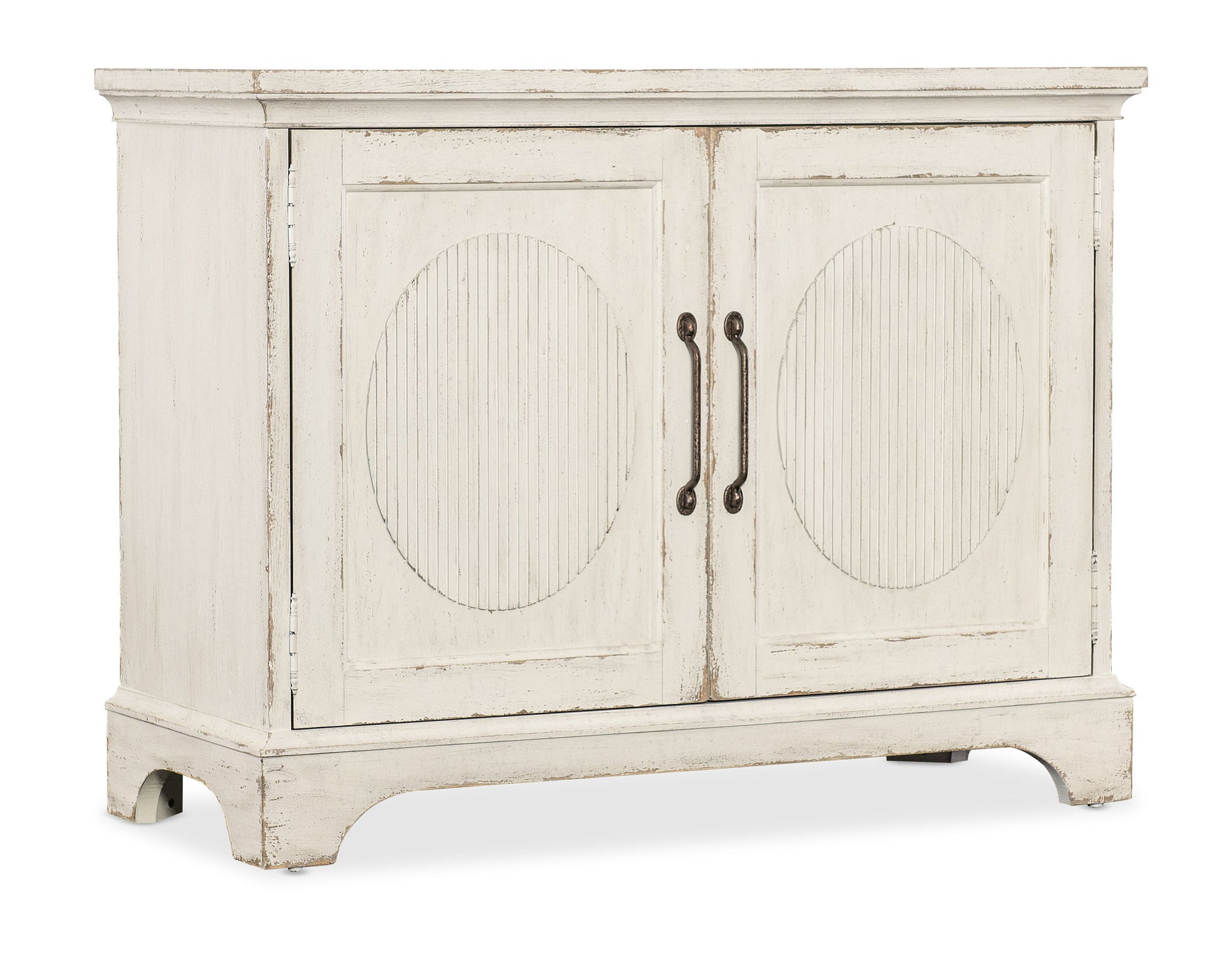 In a classic, charming design with a nostalgic flair, the Americana Two-Door Chest features a carved oval motif on the door fronts and a softly-shaped base. The two doors have magnetic catches and one adjustable wood shelf behind with a Honey-colored interior. The chest is finished in the time-worn white Daisy over Cathedral Oak Veneers, representing the natural wear one might expect of pieces passed down through the family over time, revealing the rich oak character beneath. Metal alloy bar pulls are in an antique bronze finish.