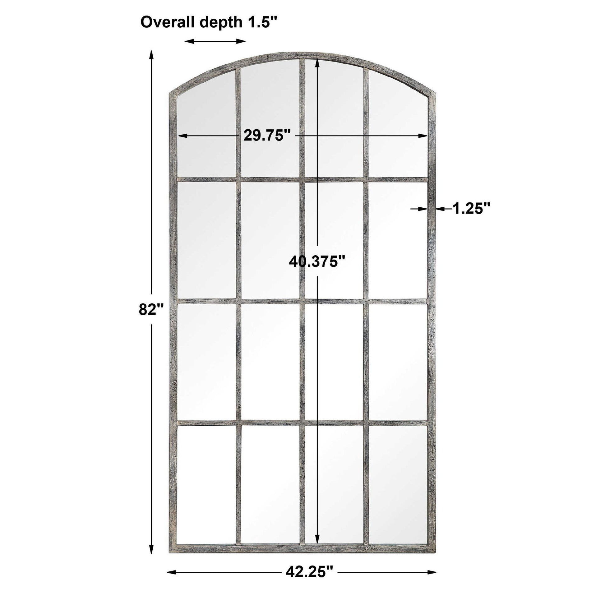 Contemporary And French Country Styles Merge In This Arched Mirror. Reminiscent Of A Large Window, This Piece Features A Hand Forged Iron Construction With An Aged Rust Gray Finish That Has Been Distressed And Covered In An Off-white Wash.