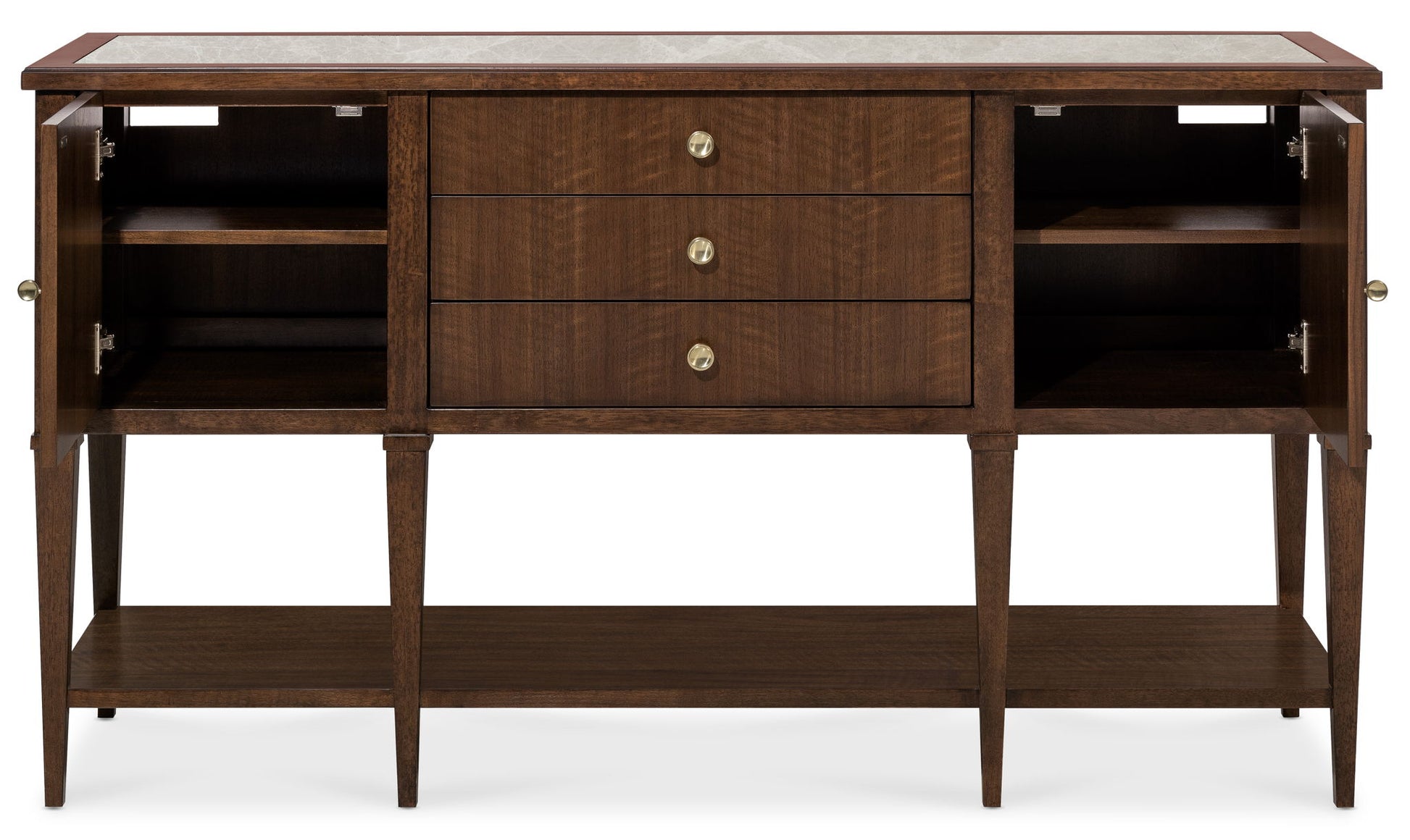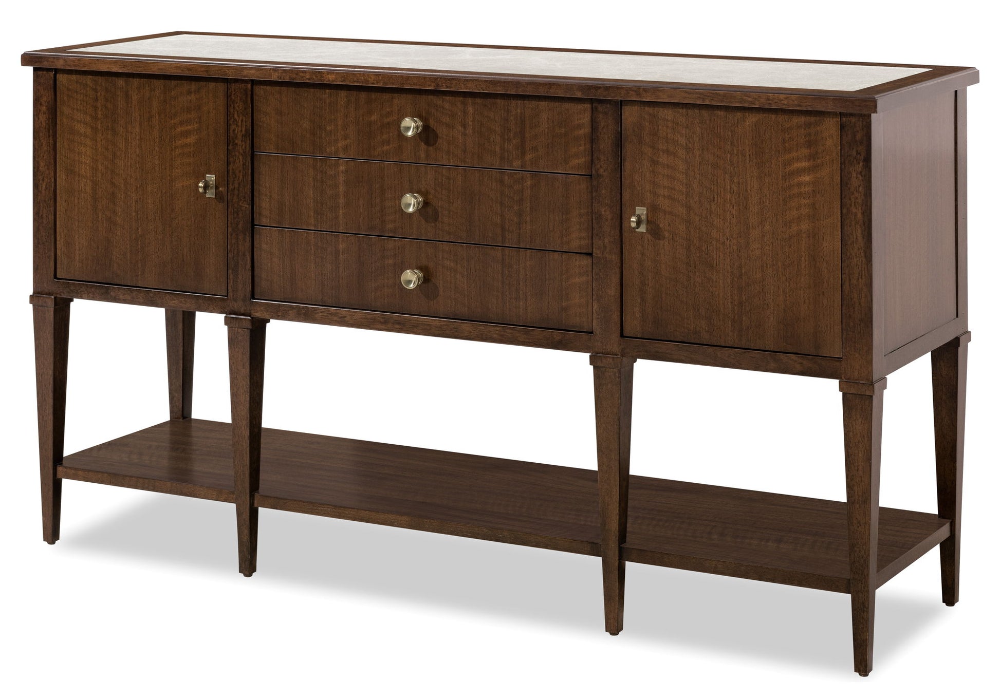 Make a sophisticated statement with the Archives Server, combining refined materials like figured walnut veneers, and a striking Castle Grey marble top. The high clarity Classic Walnut finish enhances the server’s depth and richness, while satin brass hardware adds a luxurious touch. Featuring two doors, three drawers, and an adjustable shelf, this server offers ample storage space, including a silverware tray. Perfect for the dining room, this piece offers both practical function and timeless design, ideal for those who appreciate structured elegance.