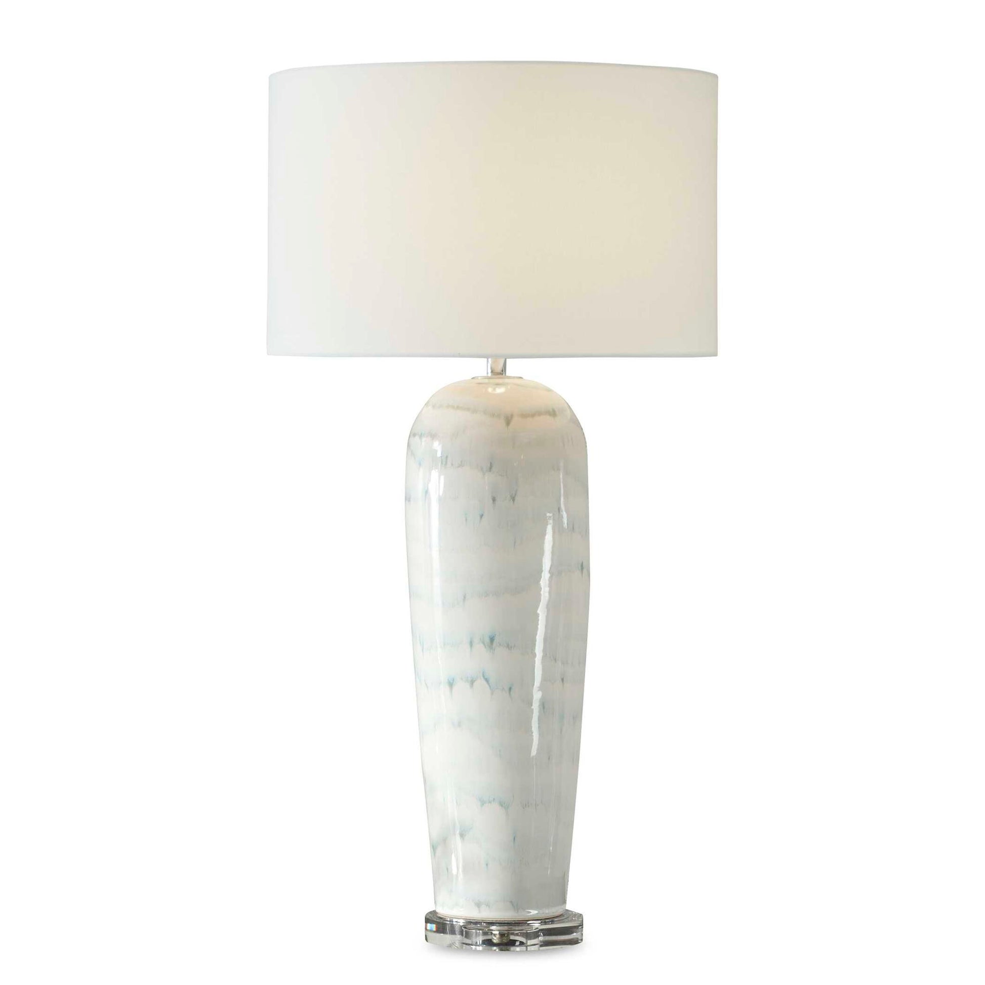 Featuring A Timeless White Ceramic Base Combined With Bands Of Melting Smoky Blue Glaze. This Piece Is Elegantly Anchored By A Thick Crystal Foot And Complemented With Brushed Plated Nickel Details. A Tapered Round Hardback Shade Covered In A White Linen Fabric. Due To The Nature Of Fired Glazes On Ceramic Lamps, Finishes Will Vary Slightly.