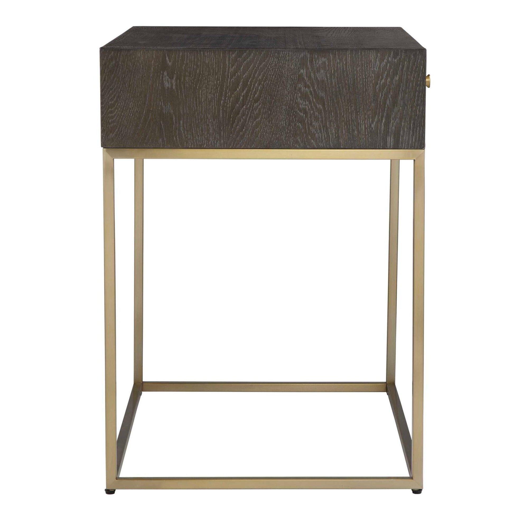 Showcasing Understated Style, The Armistead Side Table Is Layered In A Dark Walnut Finished Oak Veneer Accented With A Herringbone Drawer Front. Rests On A Steel Base In Plated Brushed Brass With A Coordinating Drawer Pull.