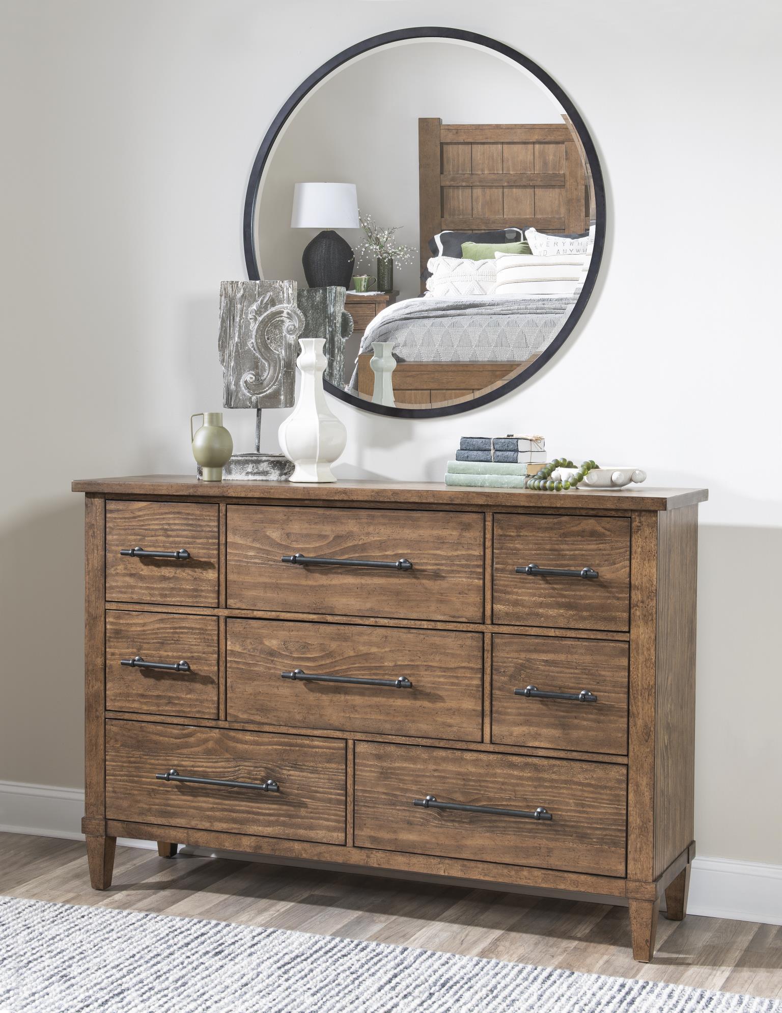 Artisan's Place by Legacy Classic - Modern redefines farmhouse style with an eclectic two-toned whole home collection. Featuring mixed media and some Craftsman design elements,, the collection is constructed of Hardwood Solids and Pine Veneers. The main finish is the clean and refined Vintage Pine,, accented by Ironwood black bases and hardware. Cabinet fronts in the eclectic farmhouse design feature metal lattice grills on the doors. While some tables have chunky legs,, others have tapered legs and urn-shaped bases.