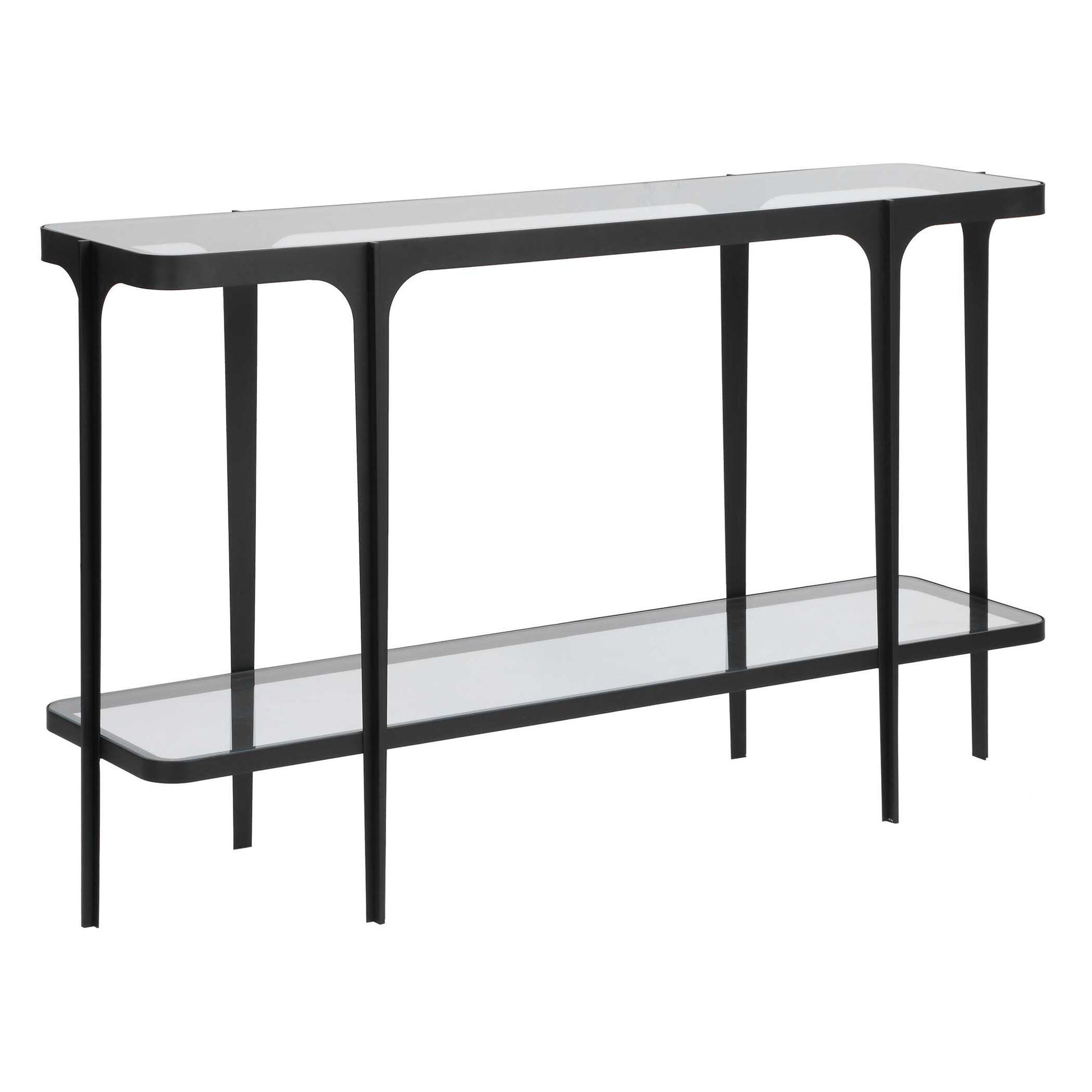 - Boasting Sleek, Clean Lines With Gently Curved Corners And A Satin Black Iron Frame, This Uniquely Designed Console Table Brings A Relaxed Elegance To Any Room. It Includes A Tempered Glass Top And Bottom Shelf.