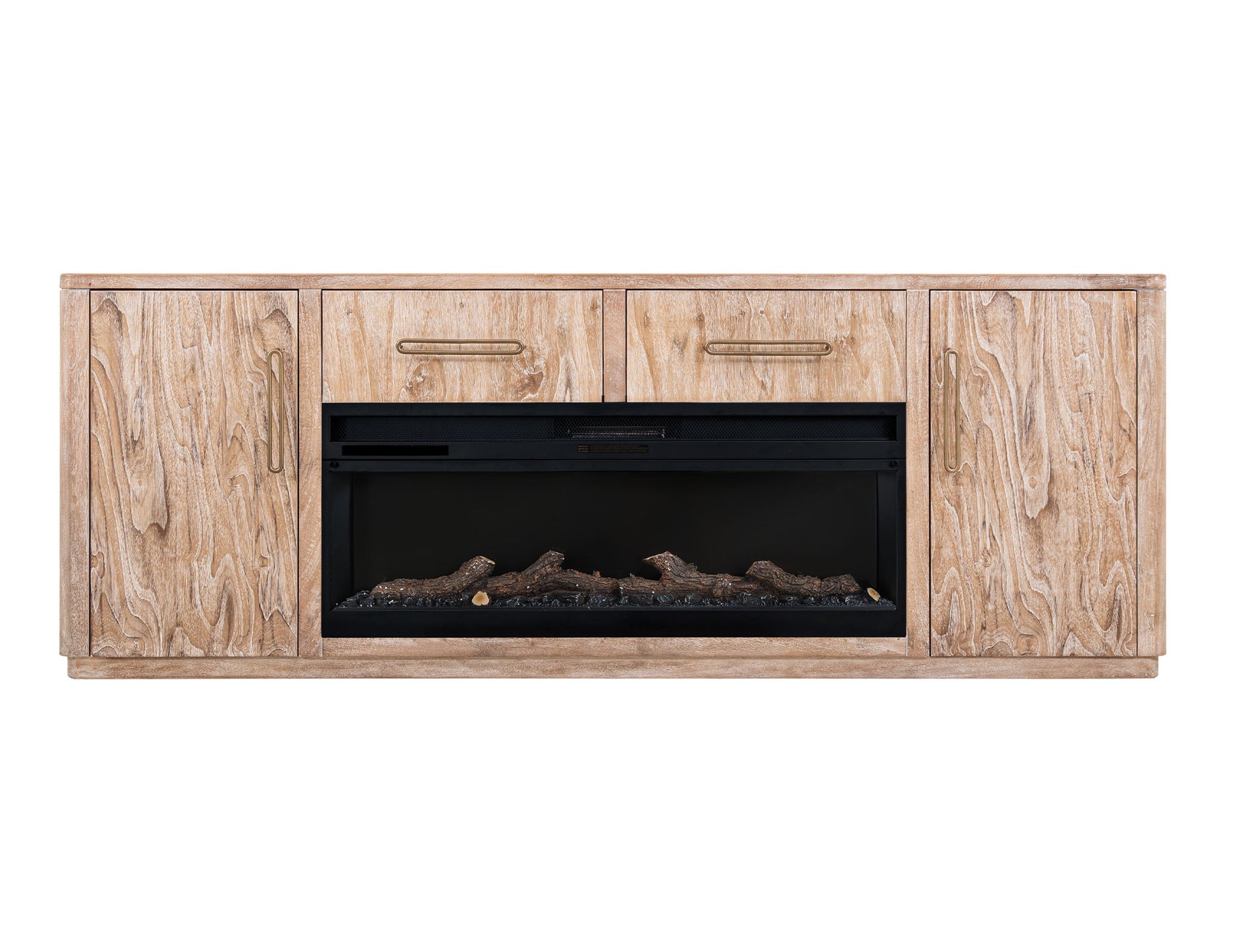 2 Drawer & 2 Door TV Stand, 80" for Fireplace. Our Balam collection is handcrafted from mango and teak wood. This simple yet stunning collection will bring an organic, modern touch to your space. This 80-inch TV stand becomes the heart of your living space, featuring two drawers and two doors for ample storage and a design that highlights the wood’s unique grain. Now enhanced with a fireplace insert, it offers not only style but also a cozy ambiance. Pair it with two matching piers to form a stunning wall unit that frames your space with harmony and sophistication. Every detail speaks of artistry, transforming your home into a sanctuary where modern design meets timeless warmth.