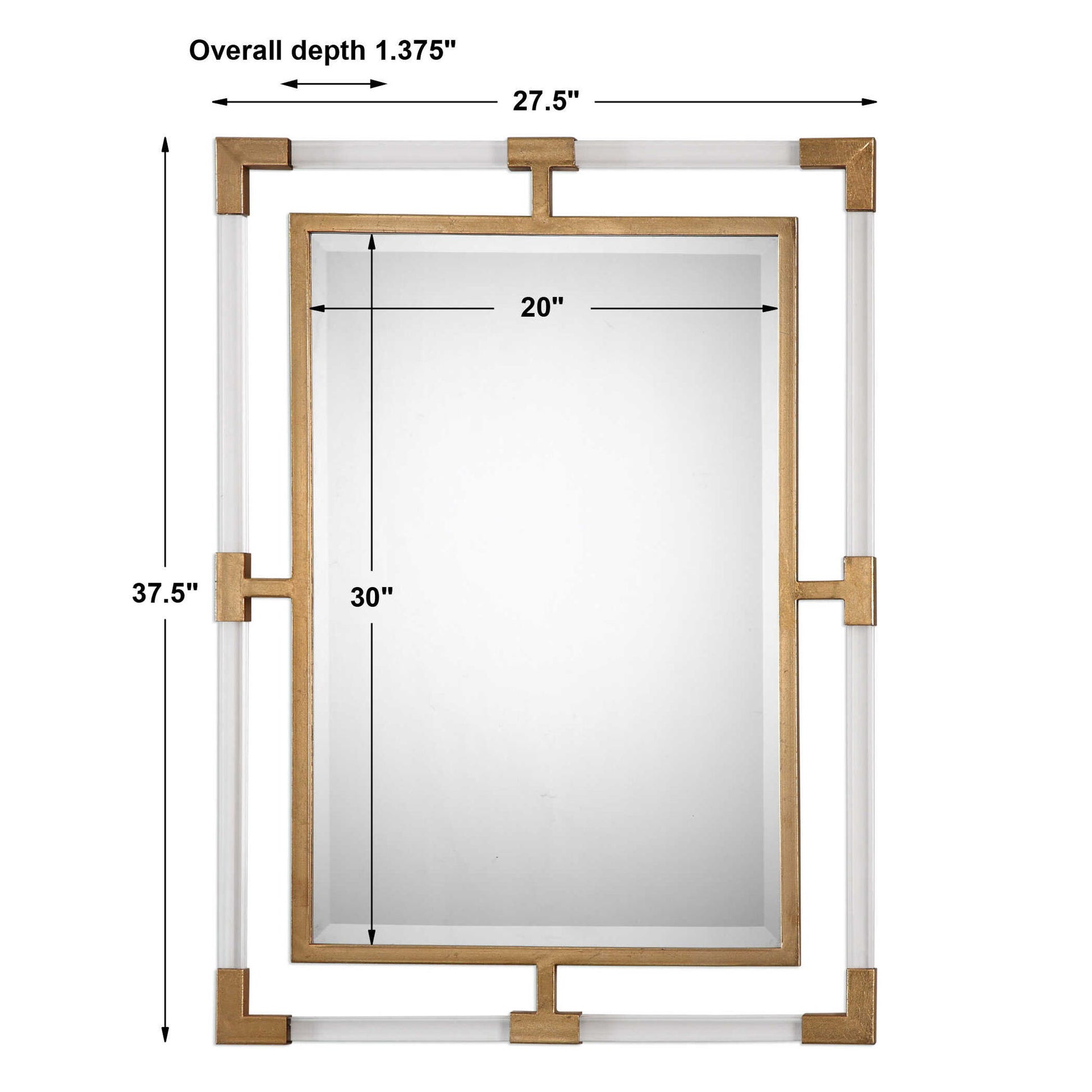 This Mirror Can Certainly Serve As A Focal Point For Any Room. Combining Forged Iron Finished In A Metallic Gold Leaf With Suspended, Clear Acrylic Solid Bars Creating A Modern Feel. Mirror Has A Generous 1 1/4" Bevel And May Be Hung Horizontal Or Vertical.