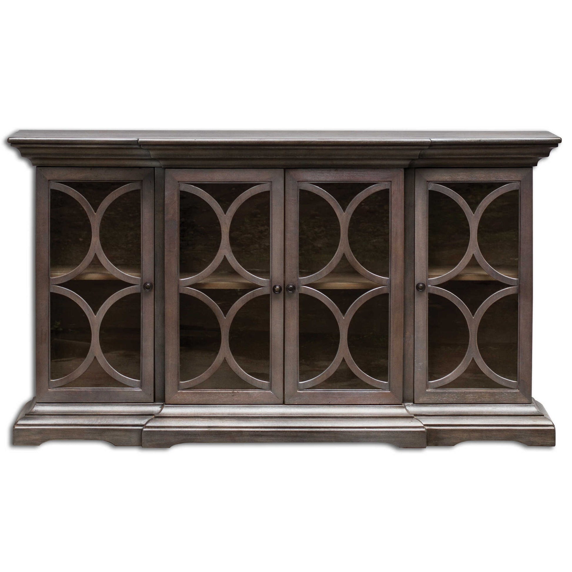 Craftsman Built With Breakfront Styling, Carved Molding Details, And Elegant Paris Silver Finish, A Subtly Metallic Silver Over A Walnut Finished Fine Wood Grain With Clear Glass Doors.