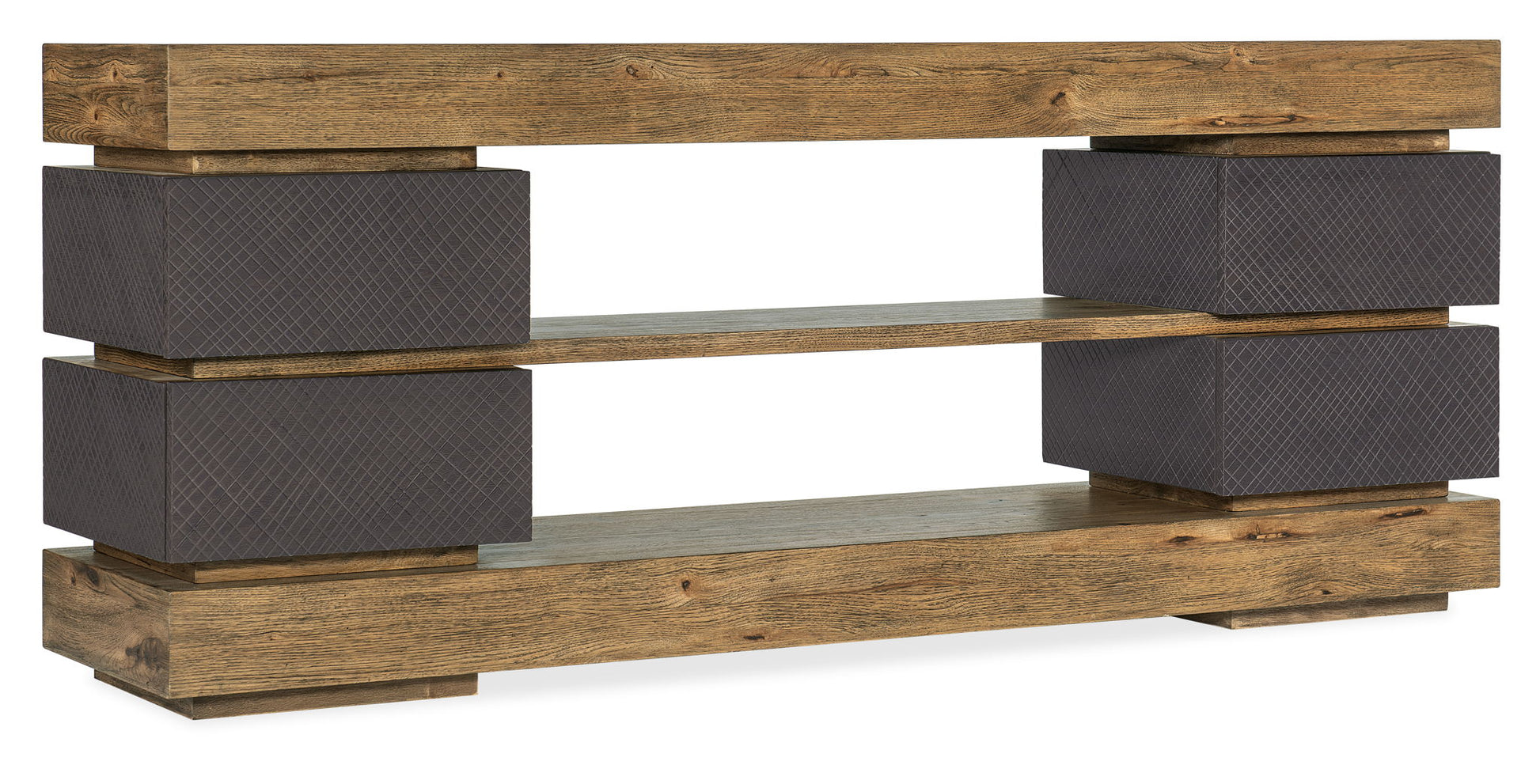 Evoke the iconic rugged landscapes of the American wilderness with the Big Sky Entertainment Console. Accommodating up to an 80-inch TV, the console features a two-tone finish contrasting a charcoal color with a crosshatch texture on the drawers with a warm, rustic, natural finish on the top, base and shelf. Crafted of Pecky Hickory Veneers, Resin and Solid-Wood Edged Top, the drawers have self-closing guides and painted black interiors. Finished on all sides.