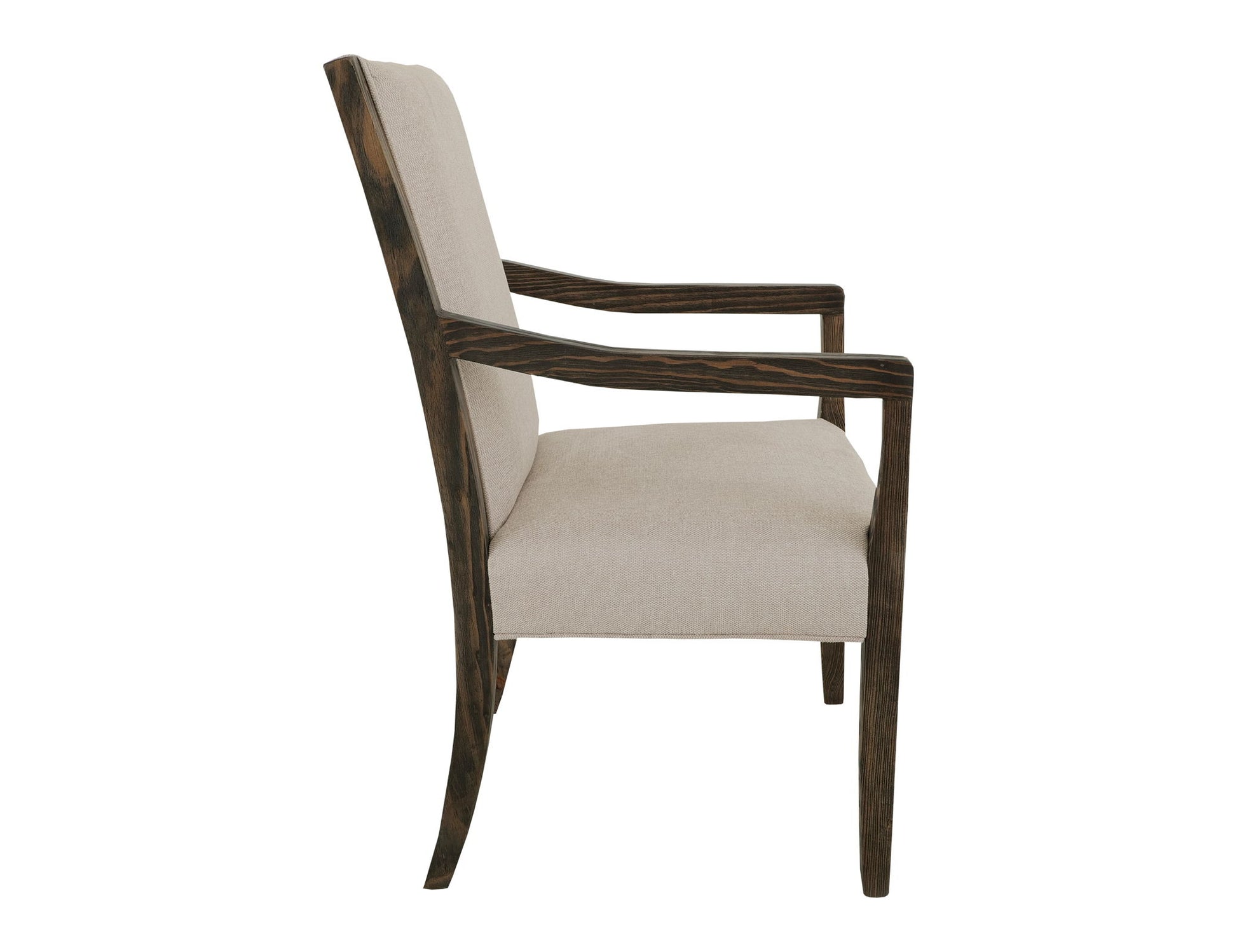 Upholstered Dining Armchair. The Verona armchair is expertly crafted from pine wood, offering a beautiful blend of style, durability, and natural elegance. It features a dark-stained frame, gently curved armrests, and gracefully tapered legs. The seat and backrest are upholstered in a soft beige fabric, adding warmth and comfort to its refined design. With its timeless aesthetic and inviting texture, this chair perfectly balances classic craftsmanship with everyday functionality, making it ideal for cozy reading corners, stylish office settings, or as an accent piece in any modern living space.