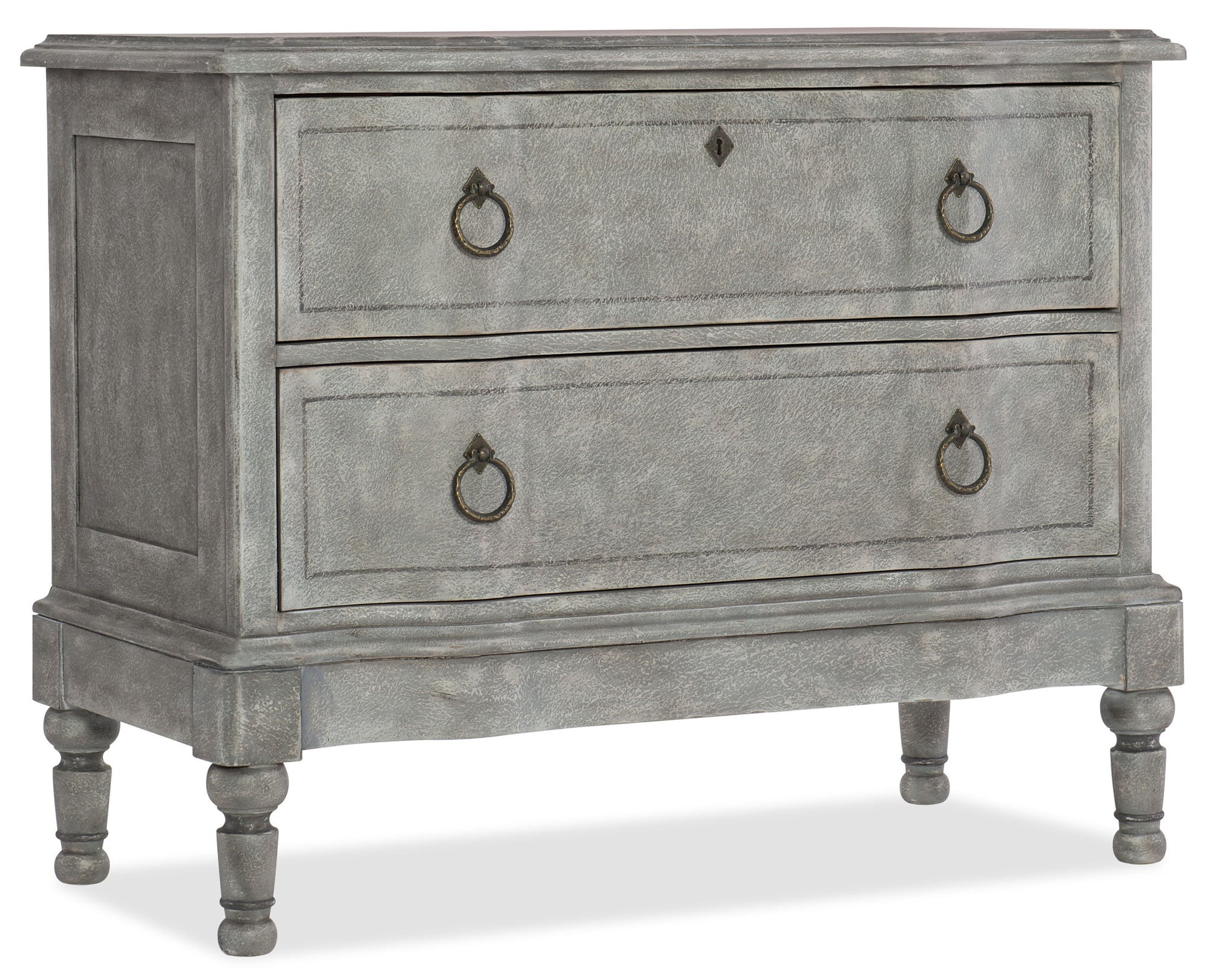 Inspired by the Belgian design aesthetic, the lyrical blend of blue toned neutrals in the Verbena Bachelor's Chest features the Stonewash finish, a play of blue, white and gray on a finely textured surface. With two drawers, there's a drop-in felt liner in the top drawer, cedar-lined bottom drawer and a touch dimmer switch.