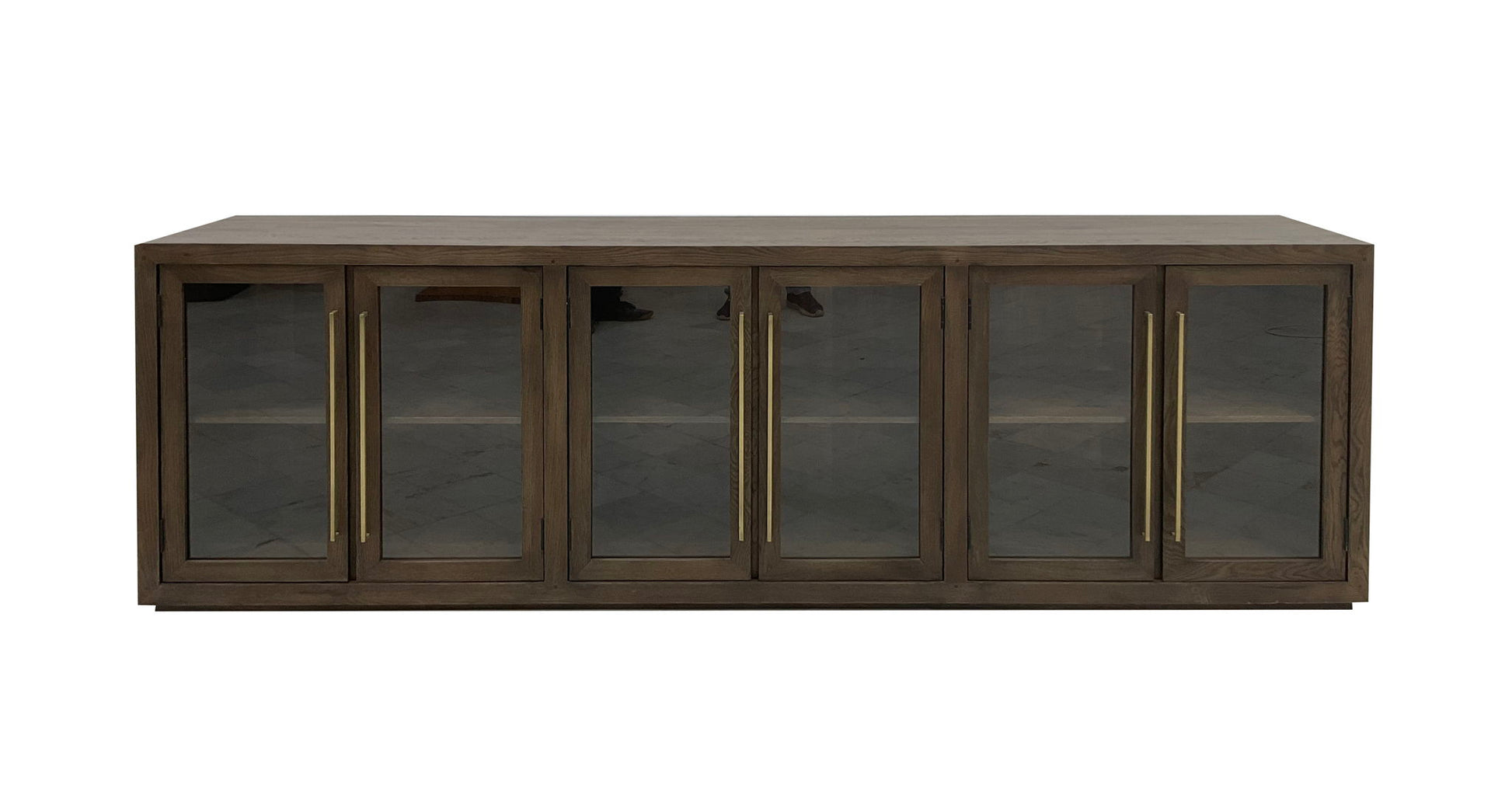 The Bradley Collection exudes classic charm with the strength of solid oak and a water-based finish that highlights its natural grain. Featuring six soft-close doors with antique brass hardware, it offers ample storage and floating shelves for added versatility. This design delivers refined elegance and timeless functionality, making it a perfect addition to any space. Available in Landmark Brown and White Wash.