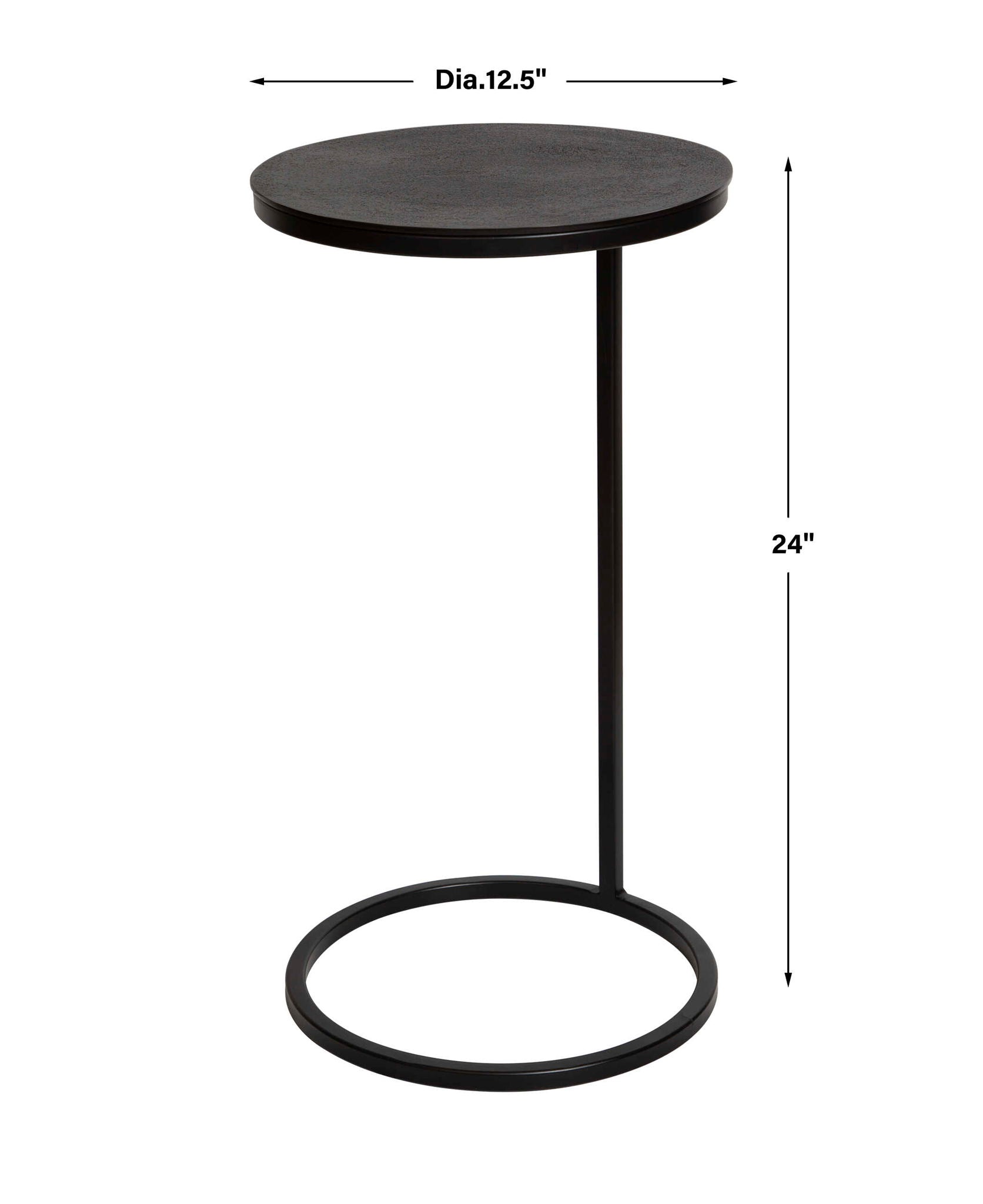 Modern And Streamlined, This Round Accent Table Is Constructed In An Aged Black Iron Featuring A Cast Textured Aluminum Slab Top Finished In A Plated Antique Bronze.