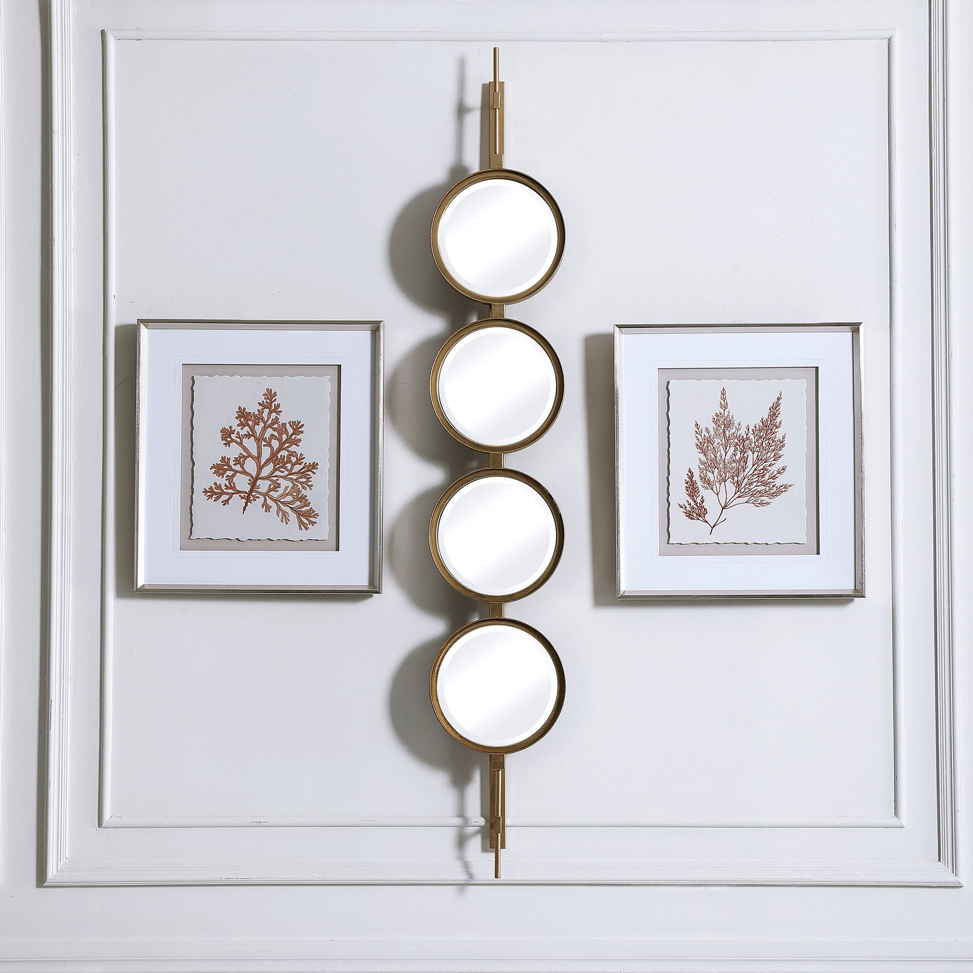 Contemporary In Style, This Mirror Features A Sleek Iron Base With Linear Metal Accents. The Piece Is Finished In Gold Leaf With Four Round Beveled Mirrors. Group Multiple Pieces Together And Hang Horizontal Or Vertical To Create A Truly Unique Wall Feature.