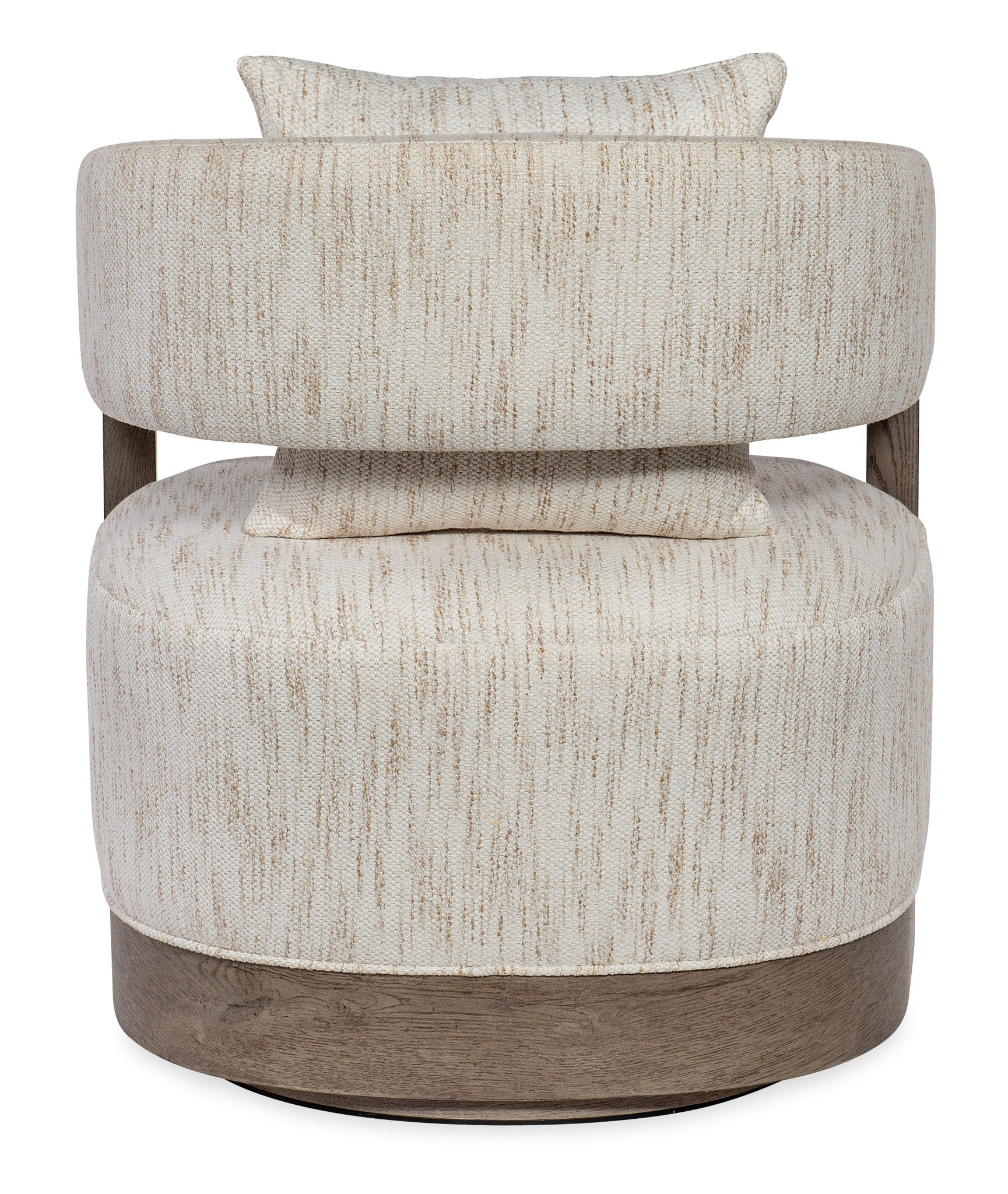Curvy, chunky and chic, the cool contemporary Calloway Peak Swivel Chair has a fabric seat and back, accented by a loose pillow. The wood base and arm fronts are crafted of Oak Veneers in an organic soft smoked gray Mink finish. The upholstered cover is Daphne Parchment.