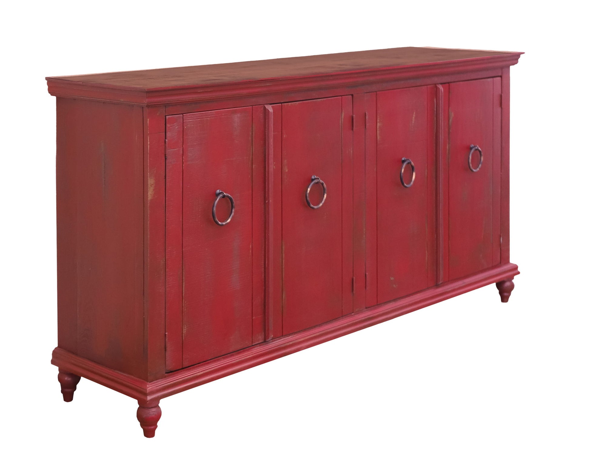 4 Door Console. The Capri console effortlessly introduces a rustic charm to your space. Inspired by the old world, its design features clean lines and hand-turned feet, culminating in a meticulous finish of hand-distressed wood.