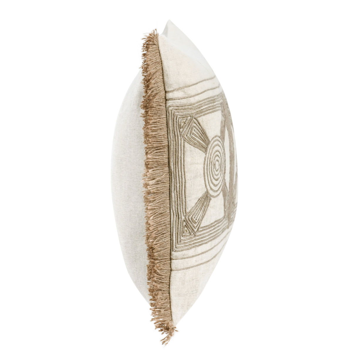 Hand-applied jute embroidery gives this pillow a sophisticated, tile-like look that elevates any space with an elegant, timeless design. Stonewashed Belgian flax linen lends subtle color variations and a classic textural look while the plump feather blend insert adds premium comfort to your sofa, bed, or chair.
