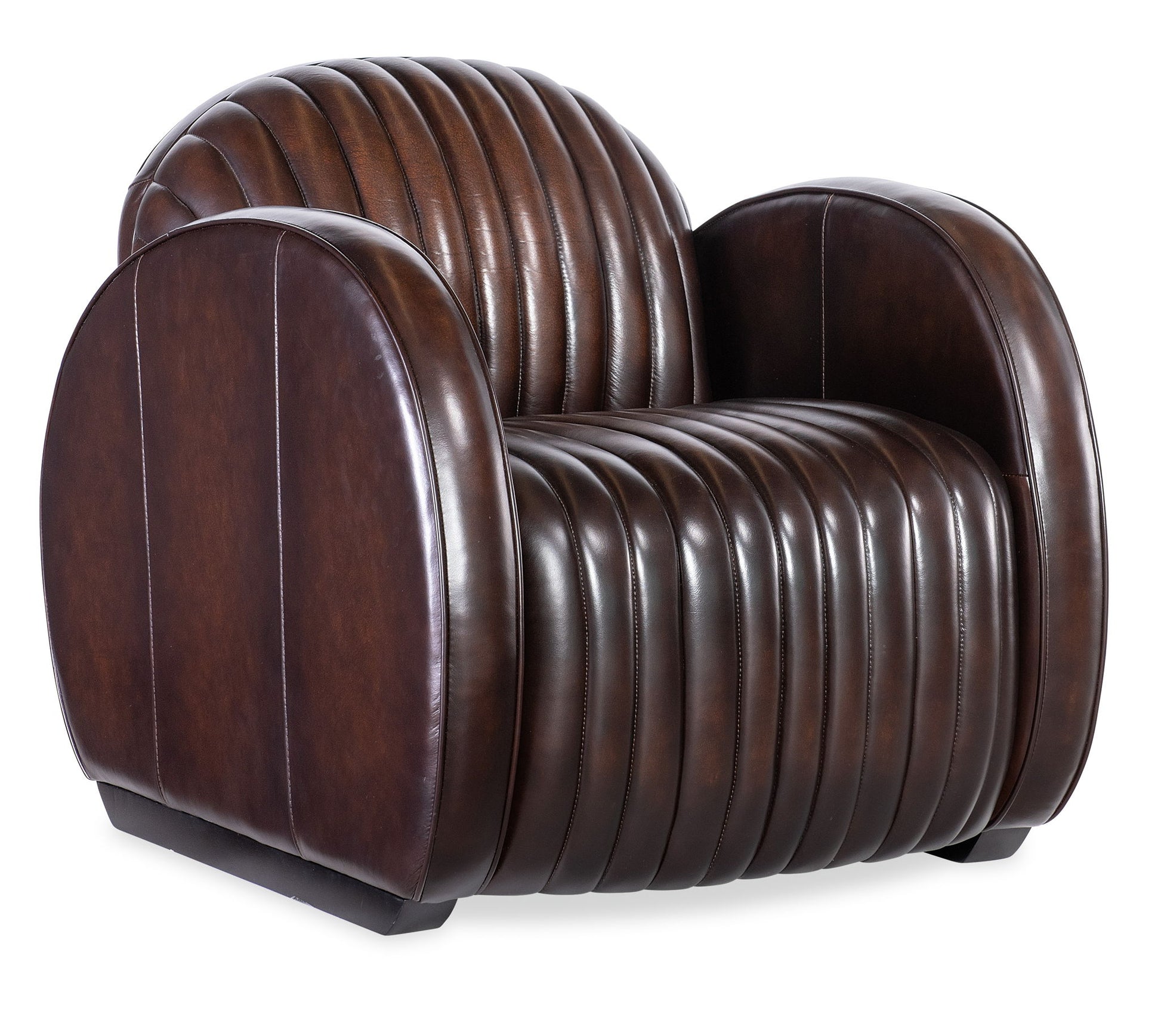 In a bold modern design with an Art Deco flair, the Banks Chair has a plush channeled back and seat and rounded track arm style with wood sled feet. Welt and topstitch trim adds an upscale feel, along with the Vortex semi-aniline top grain leather.