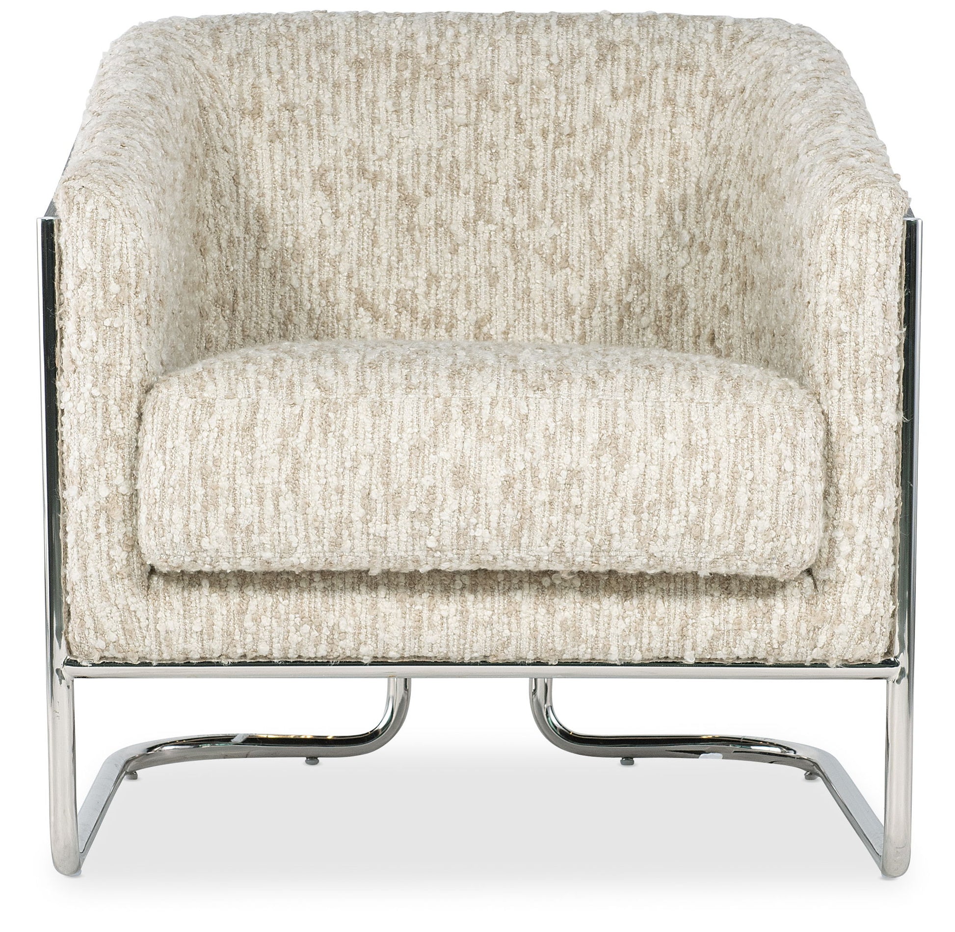 Enhance your living room with the Cody Chair from Hooker Upholstery. This arm chair blends transitional style with comfort, featuring a modern barrel back design and chic topstitch trim. Crafted from quality materials including a chrome metal frame and plush upholstery in Fluffy Natural fabric, it offers both style and durability. Perfect for those seeking a sophisticated addition to their home.