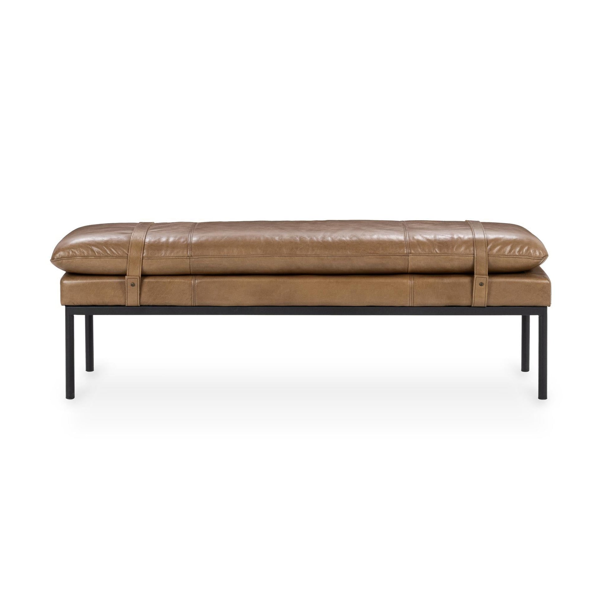 This top grain leather bench combines modern style with everyday function. Featuring a plush leather cushion secured with detailed strap accents and a sturdy black iron base, it adds warmth and structure to any space. Ideal for entryways, bedrooms, or living rooms, this leather and iron bench offers versatile seating with a sleek, industrial touch. A perfect piece for modern, rustic, or urban interiors seeking comfort and refined design.