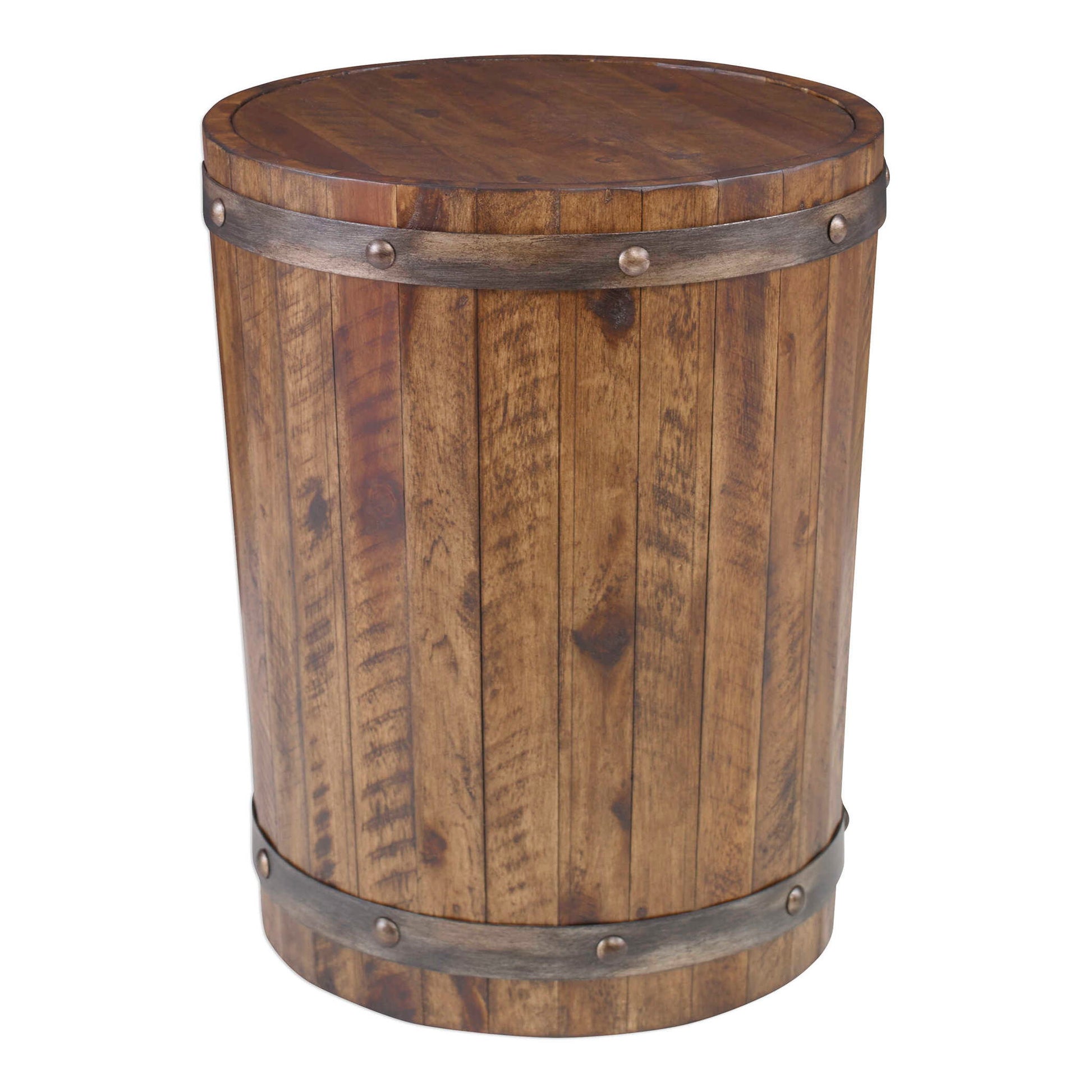 Capturing The Essence Of An Authentic Wine Barrel, This Solid Distressed Acacia Wood Piece Is Finished In A Weathered Walnut Stain, Complete With Iron Sheet Metal Strapping Accented With Riveted Details In A Burnished Brushed Steel.