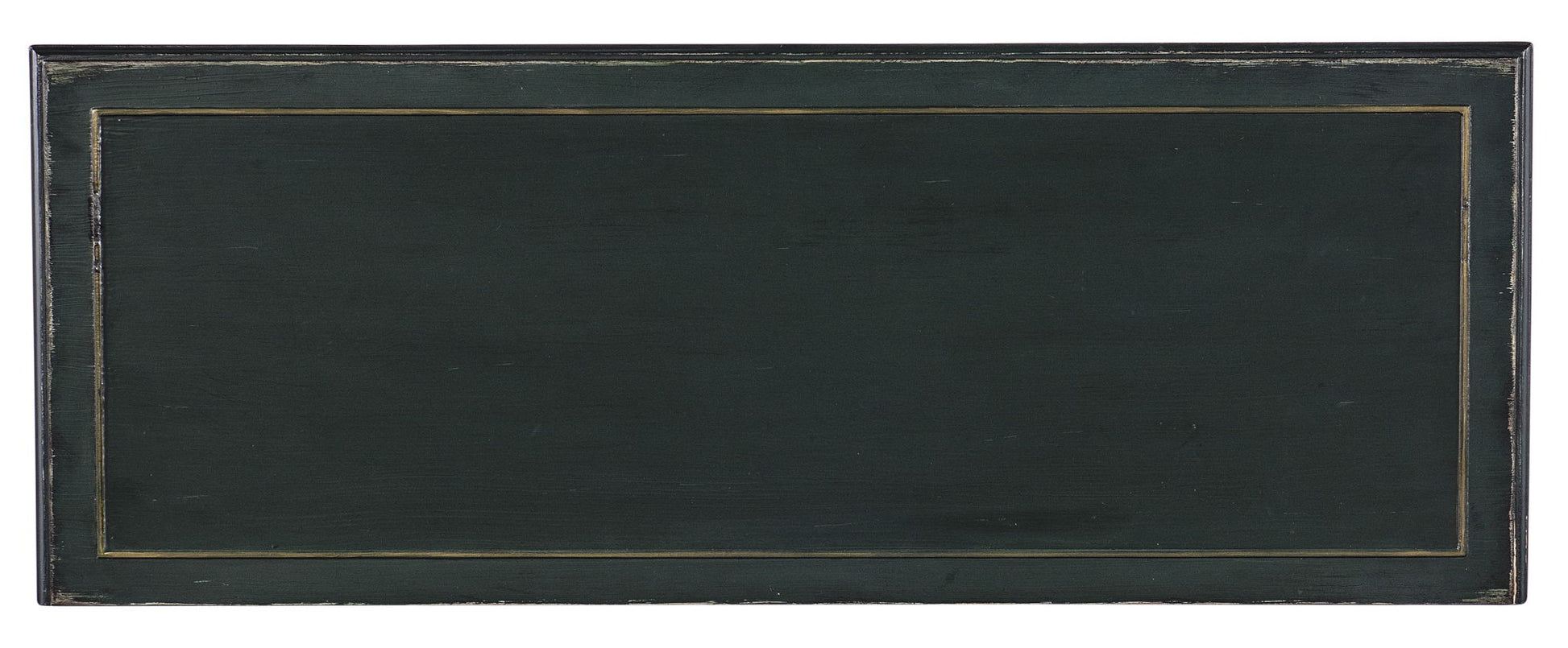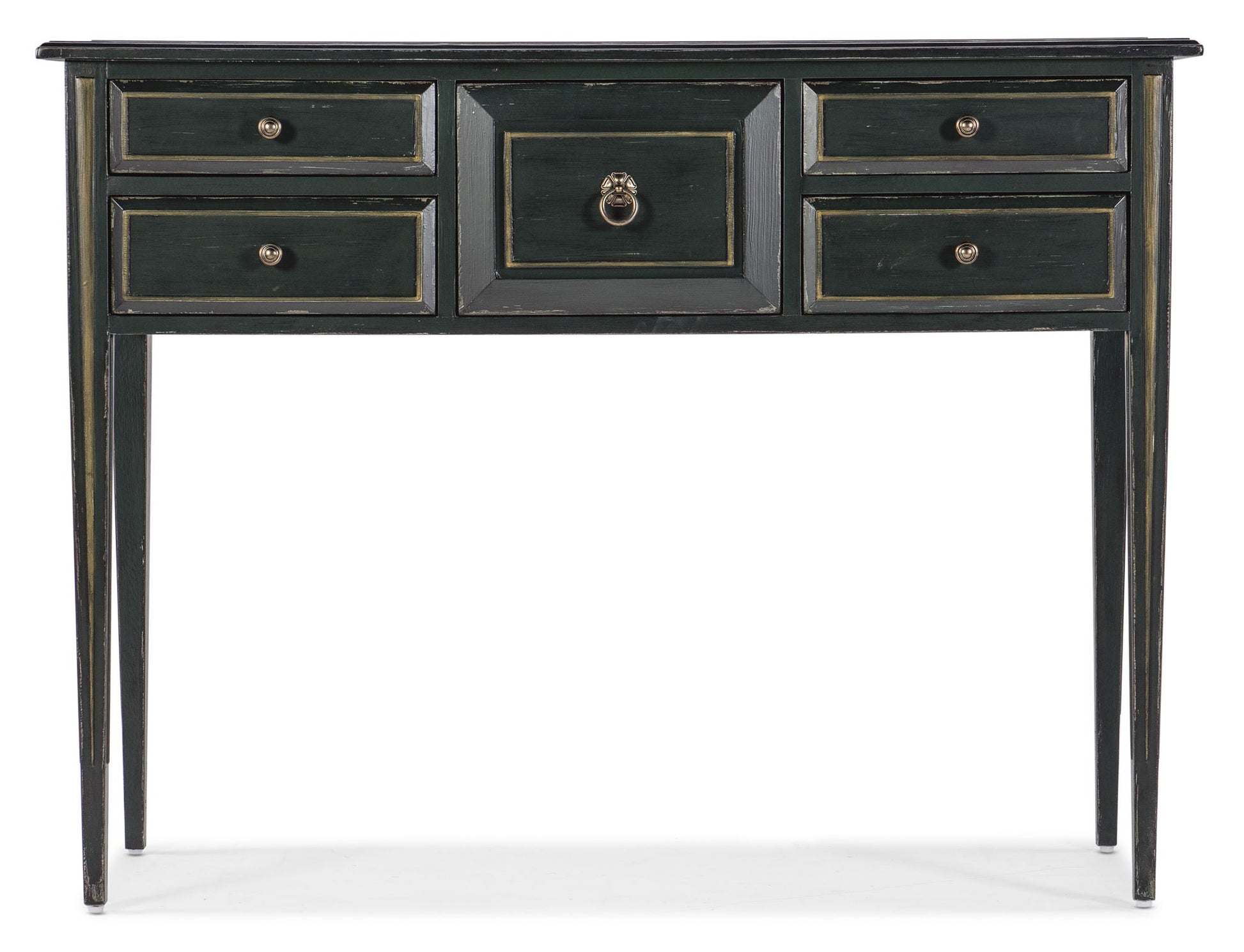 The vintage charm of the coastal South meets the traditional soul of the Federal and Georgian design period with the Charleston Five-Drawer Console Table. Featuring tapered legs and accent highlights, the five self-closing drawers on the chest are finished in a cherry color on the interior. Crafted of Maple Veneers, the table is finished in Charleston Green, a weathered interpretation of the classic dark, almost black, green that adorns trim, shutters and doors across all the historic district of Charleston. The knob and ring pulls are in an antique pewter color.