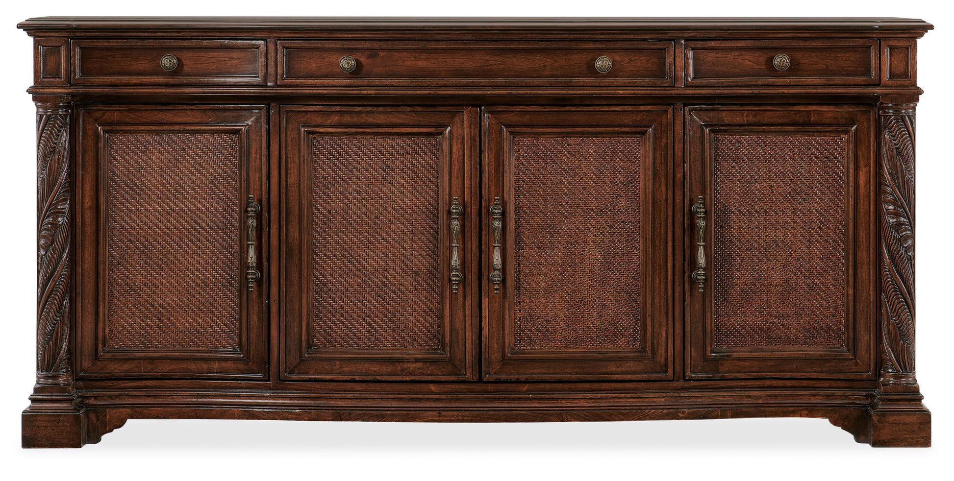 Inspired by the tropical craftsmanship of the West Indies and the woven cane accents of classic British and Dutch Colonial design, the Charleston buffet has four doors with cane fronts and intricately-carved botanical motifs on the end posts. Crafted of Cherry Veneers, Maple Inlay, Resin and Cane with a Solid-Wood Edge Top, it is finished in the vibrant Maraschino Cherry using natural grain Cherry Veneers. Behind the left and right doors and the center doors is one adjustable shelf. The left and right-side drawers are self-closing and have removable felt liners, the center self-closing drawer has a removable felt-lined silverware tray. All drawer interiors have a cherry finish, and the decorative bar pulls and round knobs have an antique bronze-colored finish. Ventilated back panel.