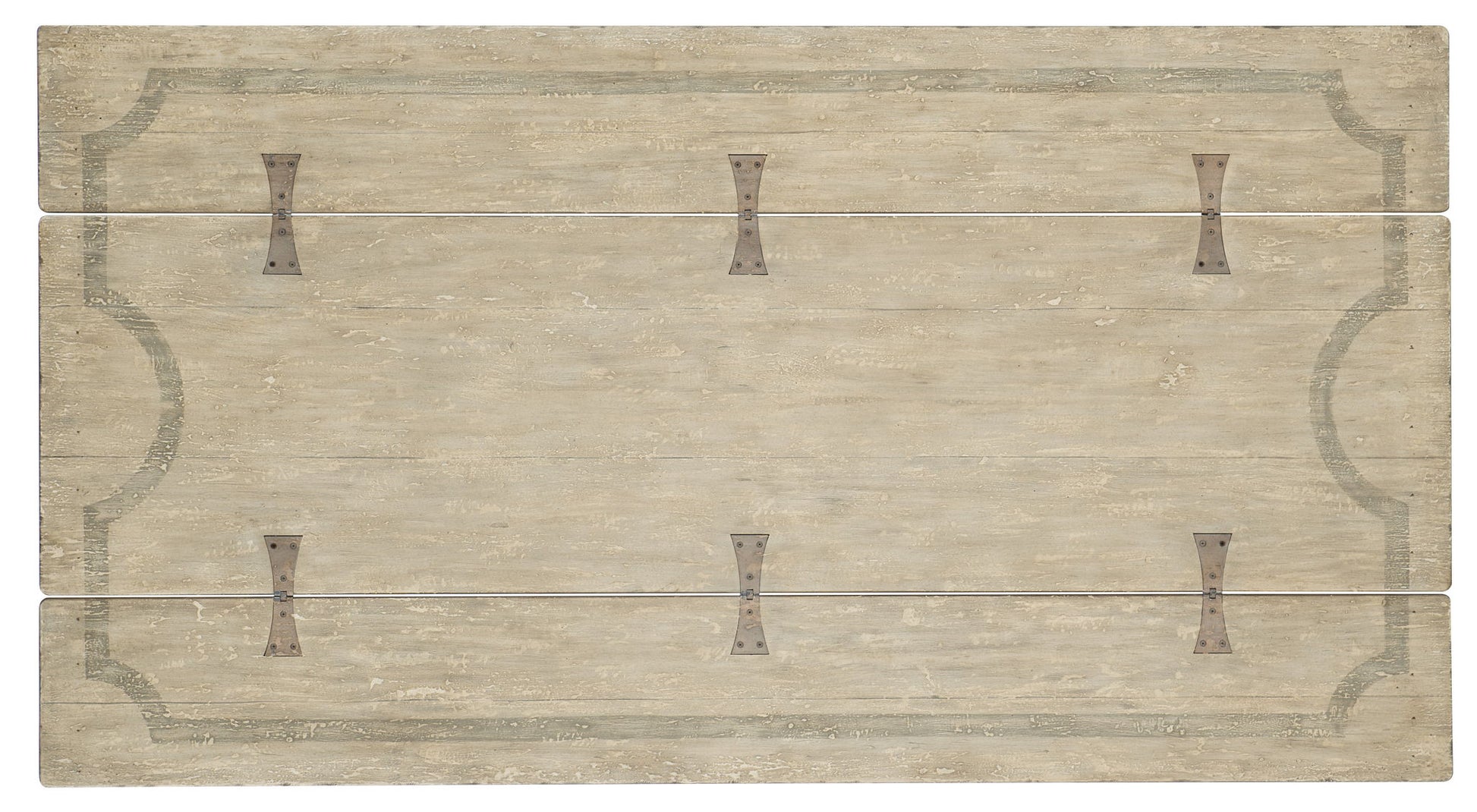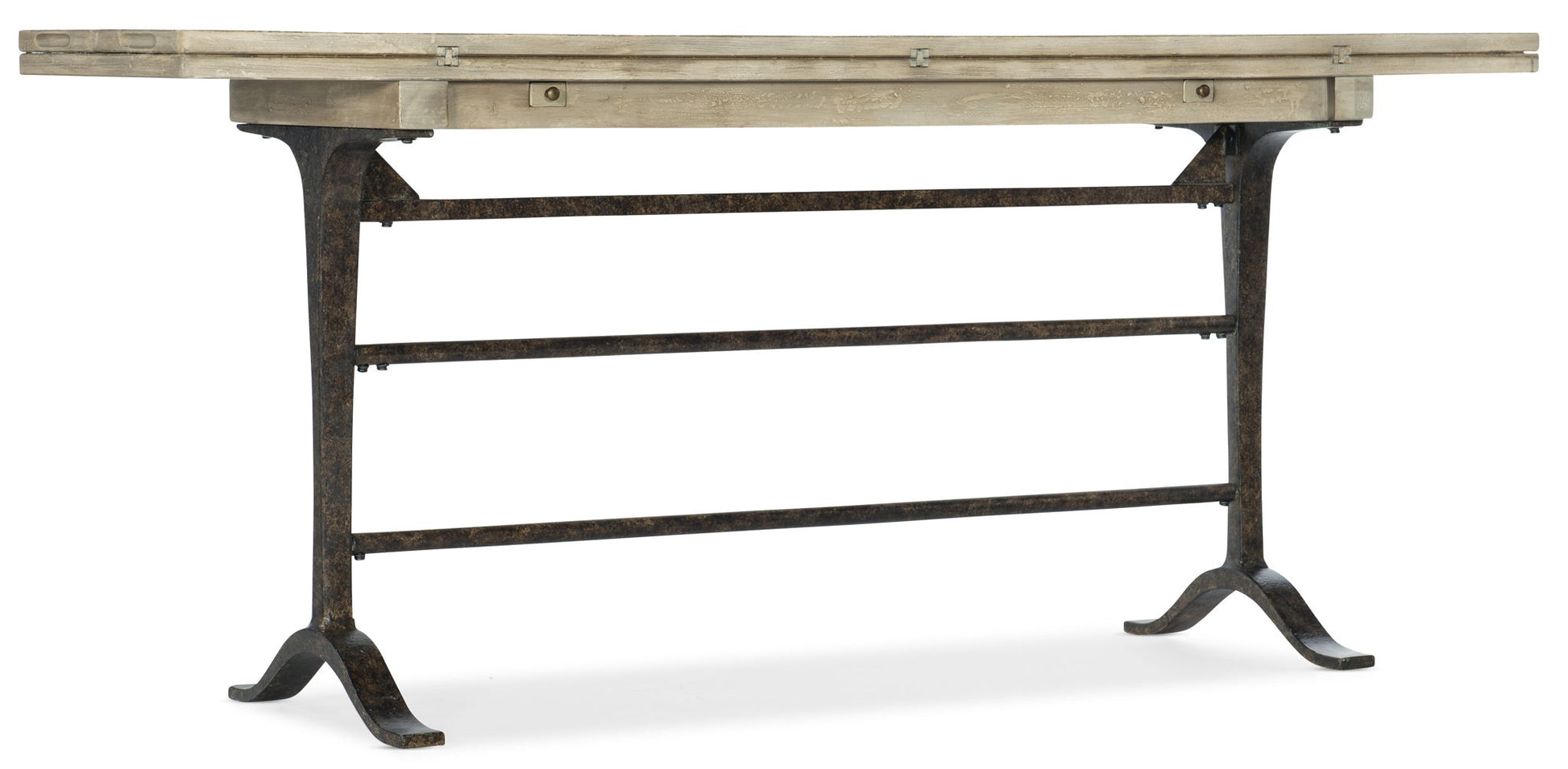 With a chic French industrial look, you can use this metal and wood console as a sofa table, desk and even for extra dining when guests arrive. Two leaves on either side flip open, and pull-out supports brace the leaves when open. The soft Flaky White finish over Poplar and Hardwood Solids with Maple Veneers contrasts with the Aged Iron base.