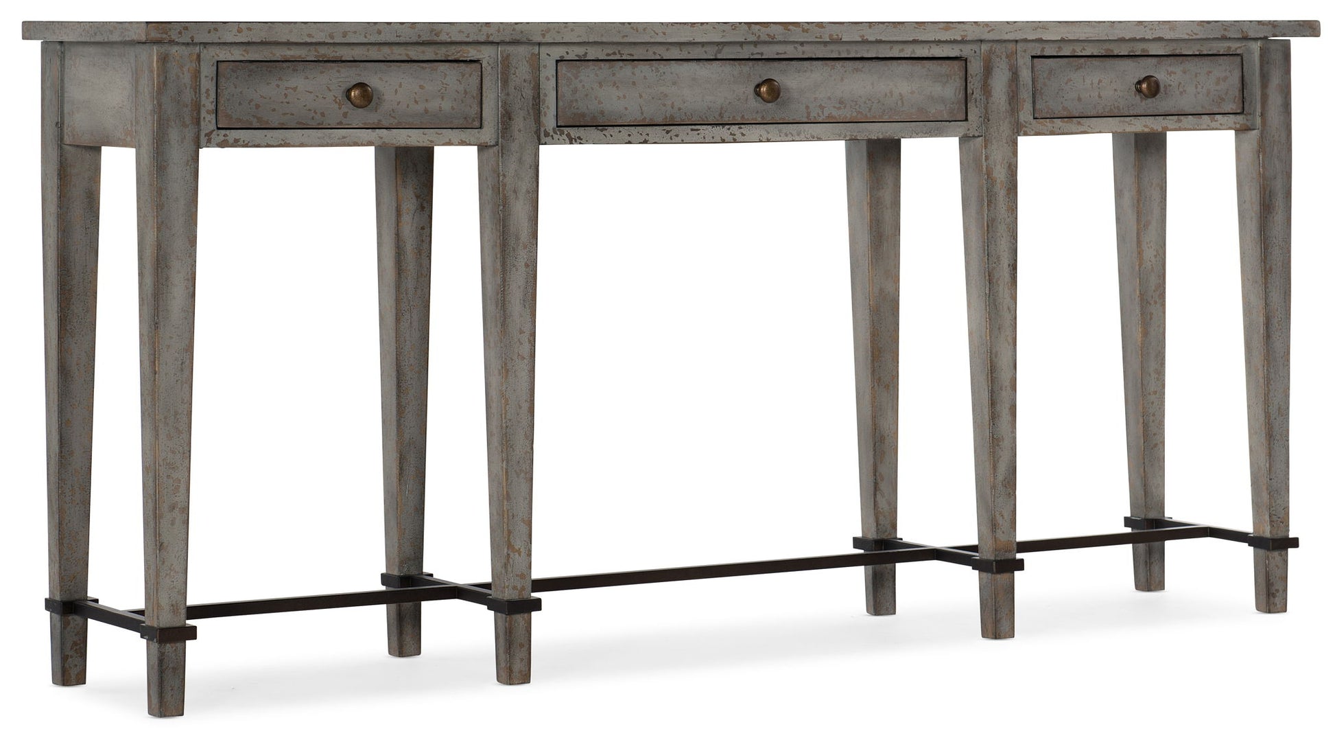 Make room for style in your tightest spaces with the 3-drawer Ciao Bella Narrow Console in a Speckled Gray finish that looks like it has aged through generations. At only 14 inches deep and 68 inches wide, the console packs fashion and function into small spaces. The Aged Bronze Metal Stretcher makes this farmhouse-inspired piece fresh and updated for today's interiors.