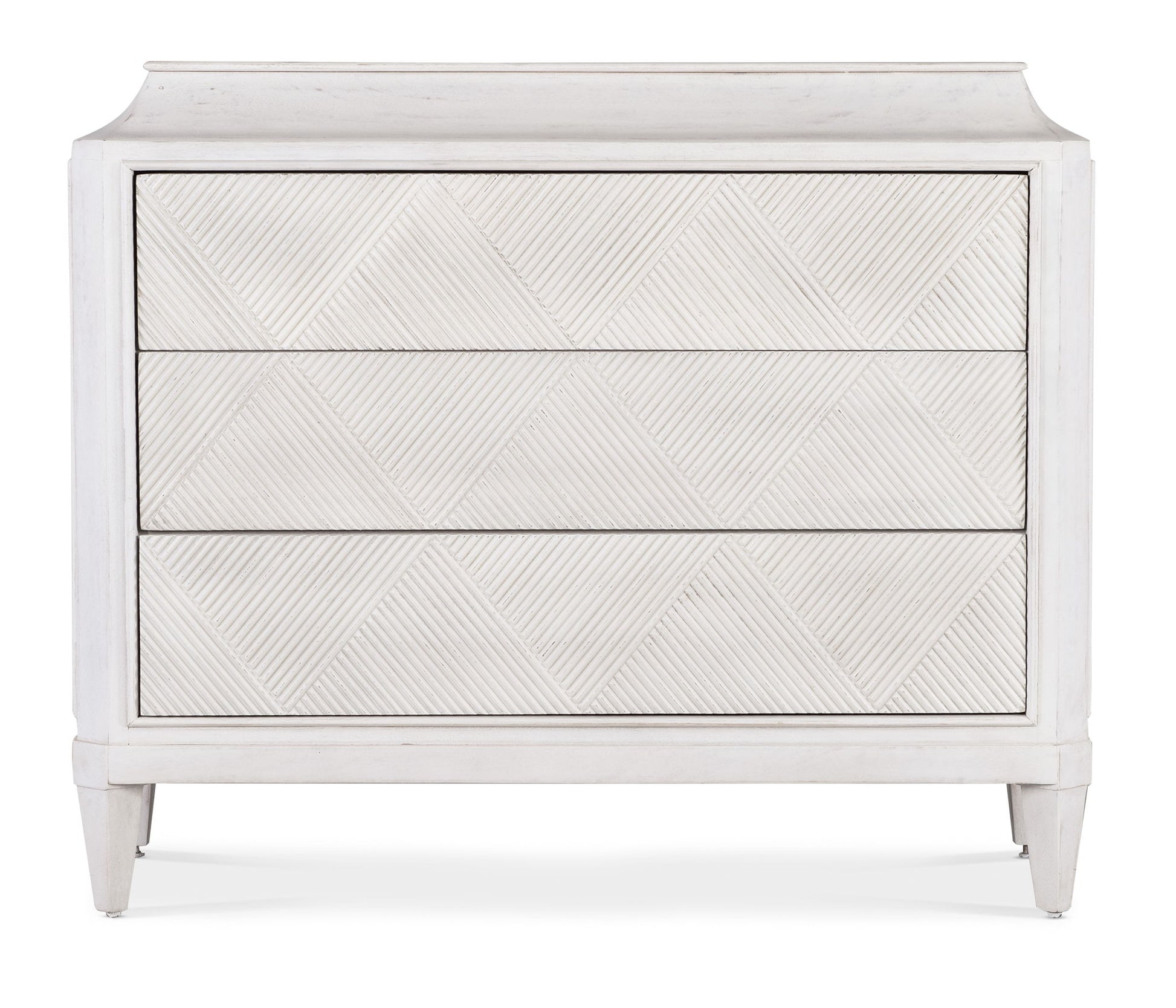 Proving that a white finish can be warm and inviting, the Argyle Chest combines a creamy white finish with textural carved grooved drawer fronts in an argyle pattern. The interior of the 3 drawers with push latches match the outside of the case. Tapered legs add an air of finesse. Crafted of Mango Solid Wood.