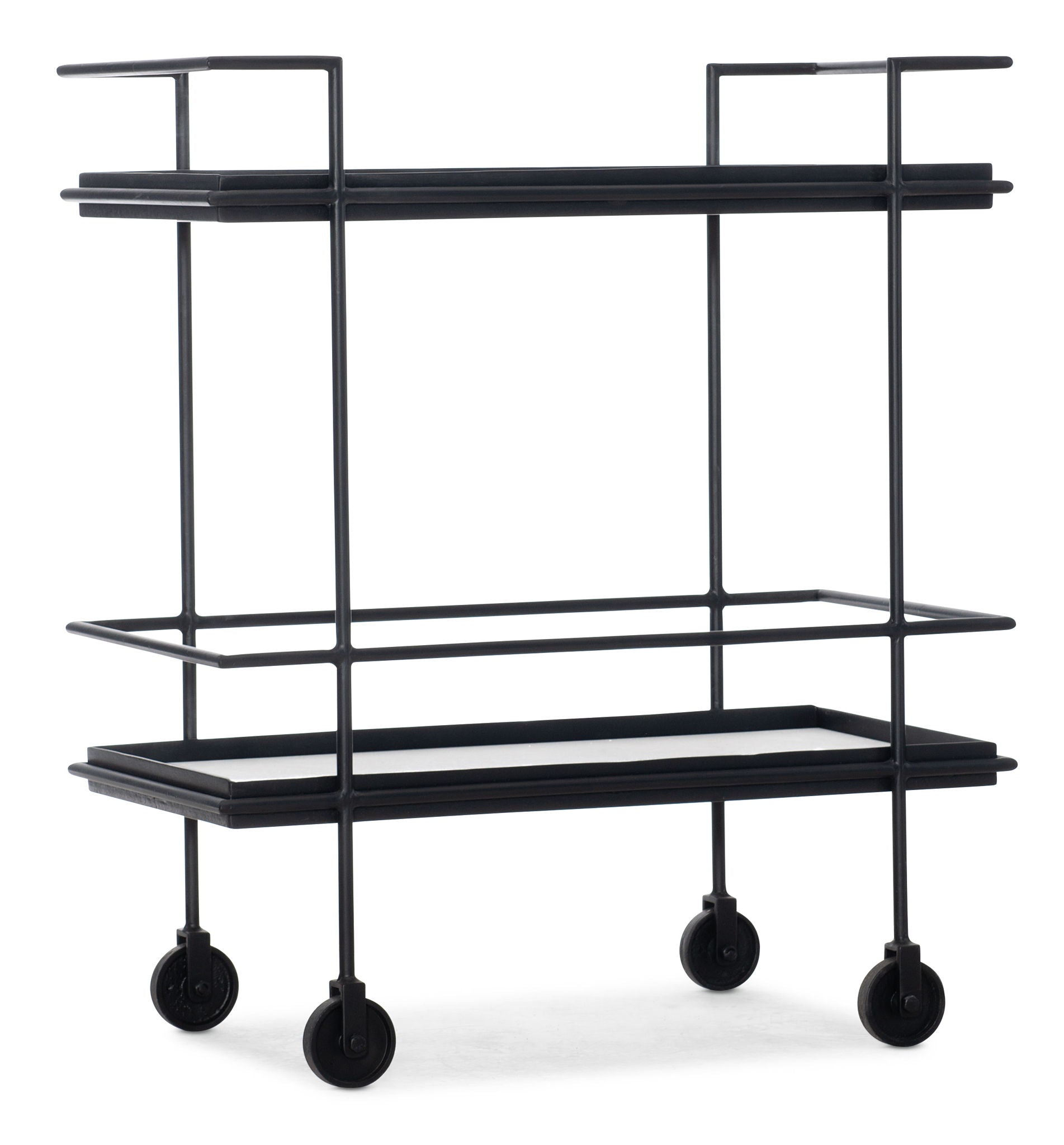 Industrial meets organic with the Commerce & Market bar cart. Offering a youthful sensibility and simple aesthetic, the bar cart combines a black metal frame and casters with a stone inlay top and bottom shelf.