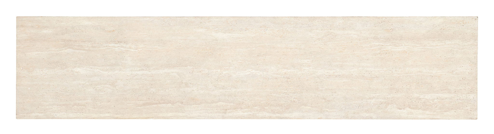 Modern materials meet timeless surfaces in the mixed-media Boomerang Console Table. With an eclectic elegance, the 61-inch-wide table combines a Travertine marble top with a metal frame and legs and one wood fixed shelf. Crafted of Oak Veneers, the marble top is cream colored with a natural medium wood finish and gray metal frame and splay legs.
