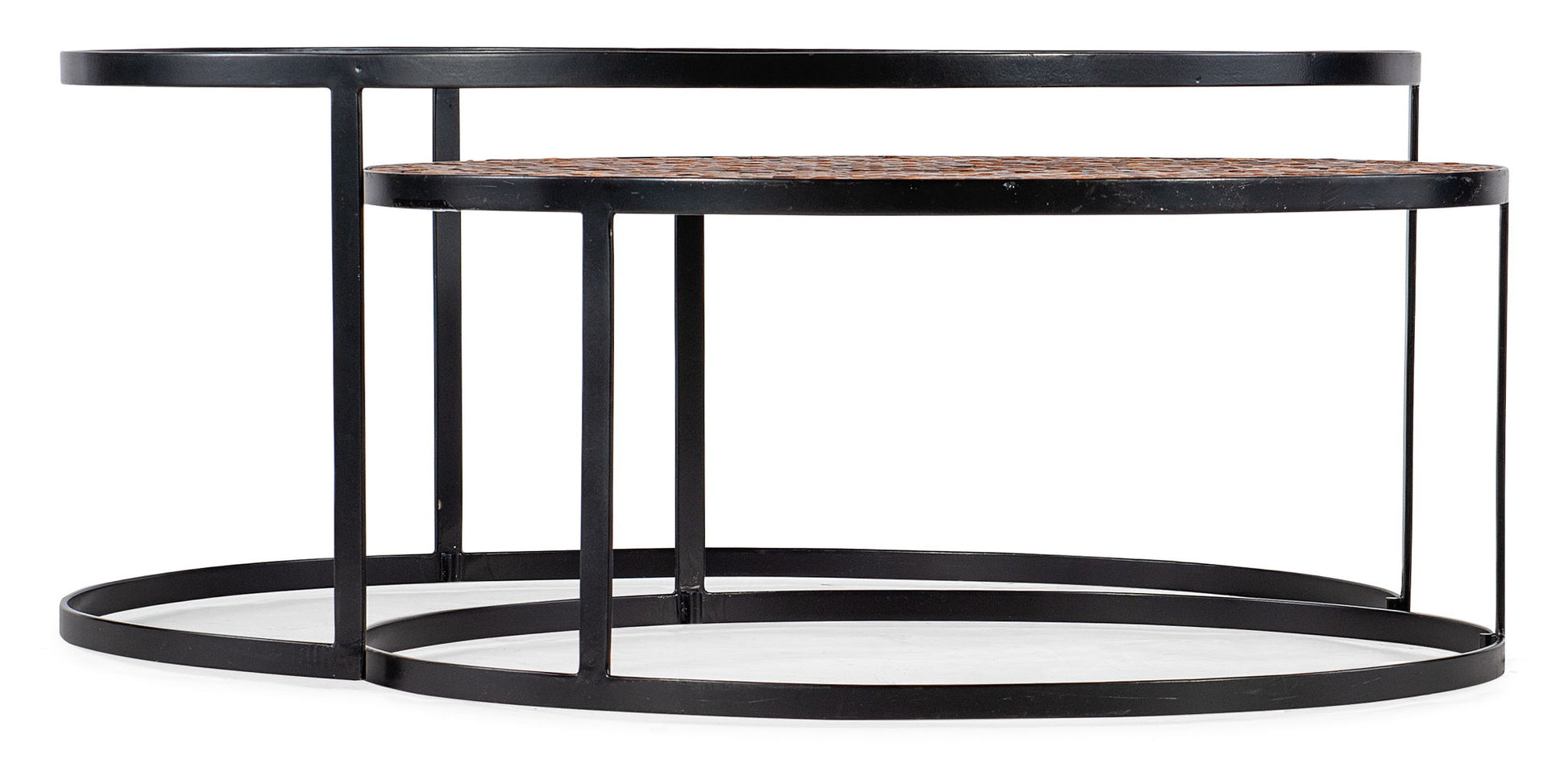 Sleek meets organic with the Chatham Nesting Cocktail Tables, featuring a glass-top larger table revealing a weave-patterned top in a natural wood multi-earth-toned finish on the smaller table below. An elliptical black metal frame ties the two tables together.