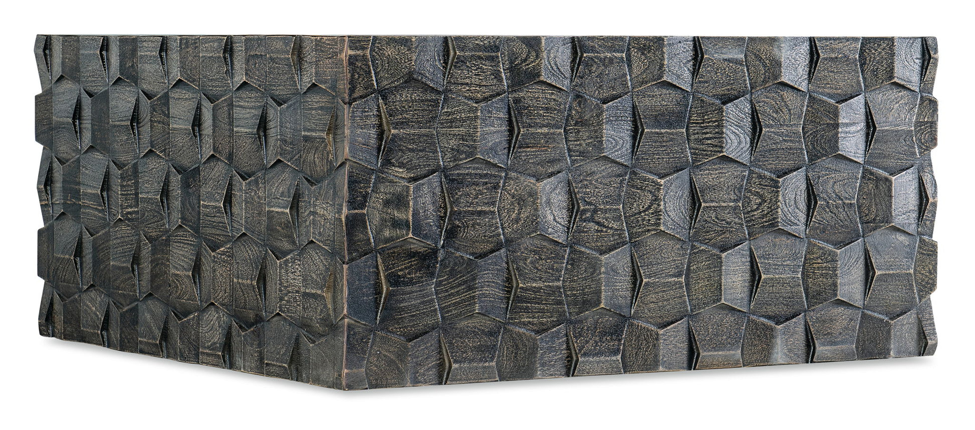 Tactile and touch-worthy, the intriguing Chiseling Cocktail Table has a chiseled carved motif on the exterior. Crafted of Mango Solids, it has a transparent black wood finish to reveal color and grain variances. The 38 x 38 square shape makes it an ideal size for a cocktail table.