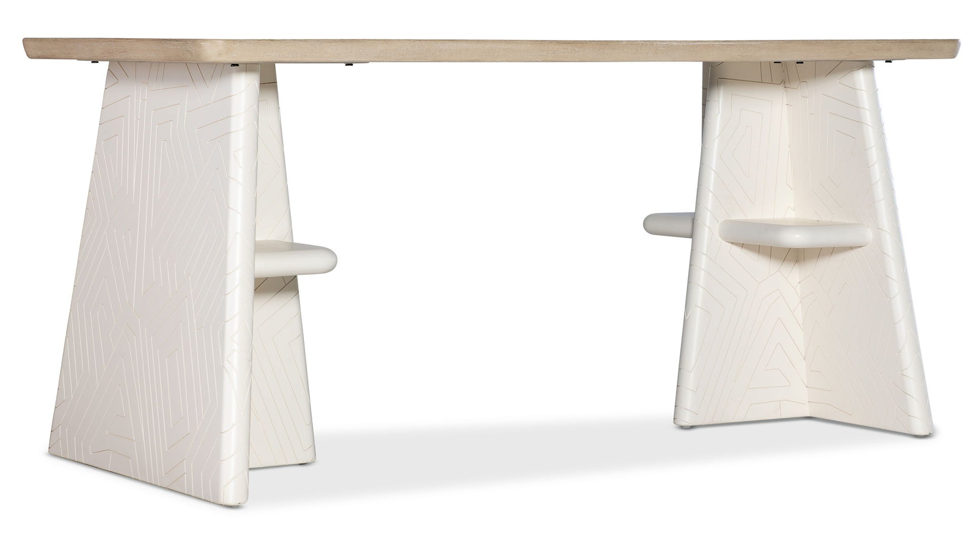 The Effie Writing Table from Commerce & Market brings together a clean, modern design with traditional craftsmanship. Its creamy white base features a geometric motif carved into the double pedestal design, while the contrasting light elm top adds a refined, two-tone finish. Ideal for home offices, this desk includes four small inset shelves for added storage, blending functionality with a striking visual appeal. Crafted from Elm veneers, this writing table reflects the attention to detail Commerce & Market is known for.