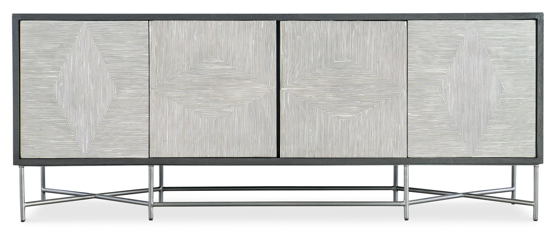 Cool, calm and chic, the Fine Lines Credenza is crafted of Mango Solids in a natural black wood finish with a brushed pewter metal base. On the door fronts is a black and white bone design in a diamond motif. The 4 doors have soft-close hinges and touch latches, and the interior finish matches the outside of the case. There’s one removable shelf behind each pair of doors. A ventilated back panel and wire management make the credenza media-friendly.