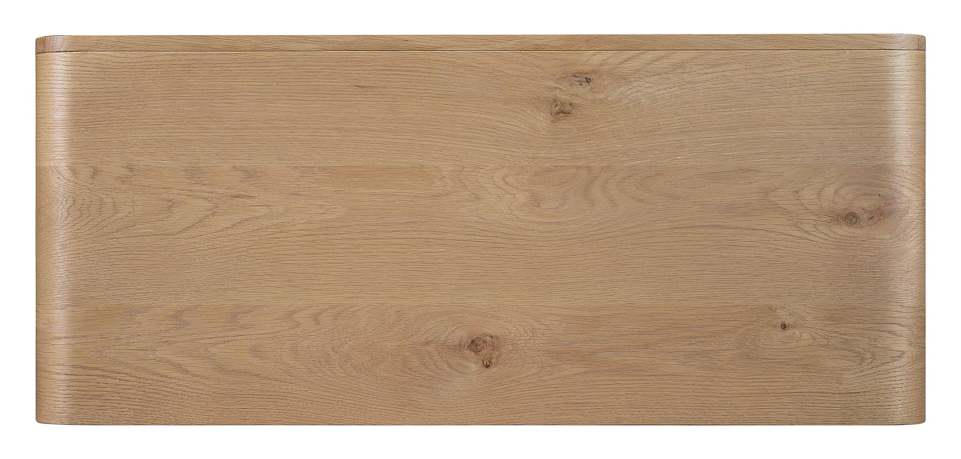The Haven Accent Chest adds a chic storage solution to any room. Crafted from oak solids and veneers with a medium natural oak finish, this chest features two touch-latch doors with faceted "window pane" fronts for a stylish look. Inside, there’s one adjustable shelf, making it a practical addition to living rooms, bedrooms, or hallways. Its rounded top edges and detailed craftsmanship create a warm and inviting aesthetic.