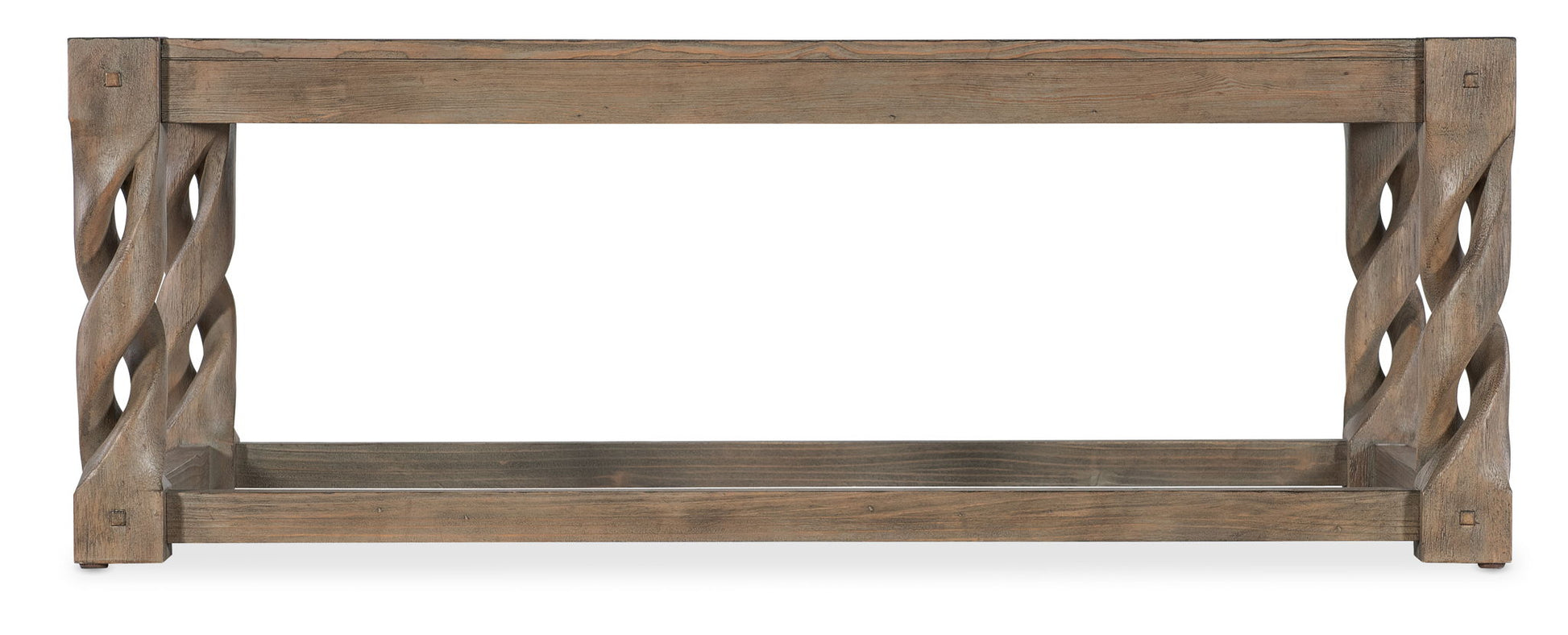 Exuding craftsmanship with attention to detail, the casual Jack O’Bein Cocktail Table has twisted legs and a paned veneer top with peg accents. Crafted of Pine Veneers, it has a medium wood finish.