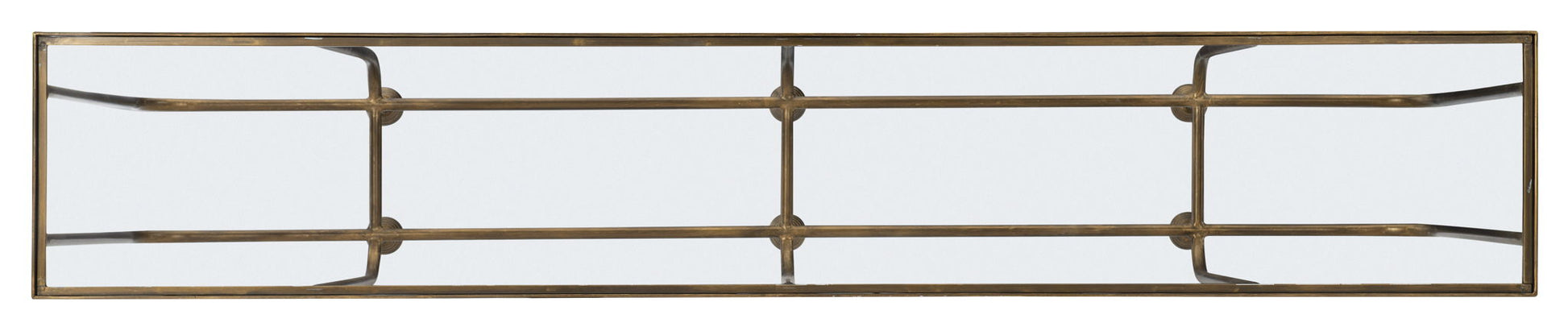 Appearing to float in air, the lightly-scaled metal-framed Kiara Sofa Console elevated on metal feet will inspire your interiors. Crafted of iron with a tempered glass top, the console is finished in bronze metal with gold undertones for a warm metal ambience.