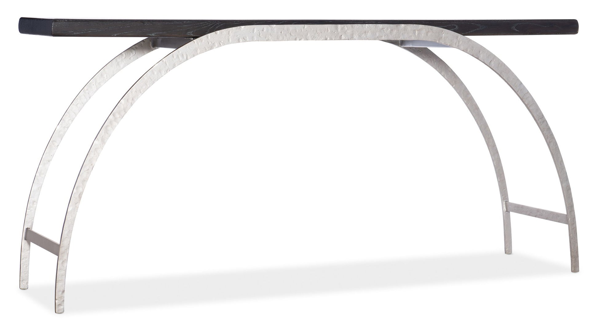 Infused with grace and energy, the Commerce & Market Metal and Wood Console combines a rustic Oak Veneer top in a black finish with an arched metal base in a silver finish.