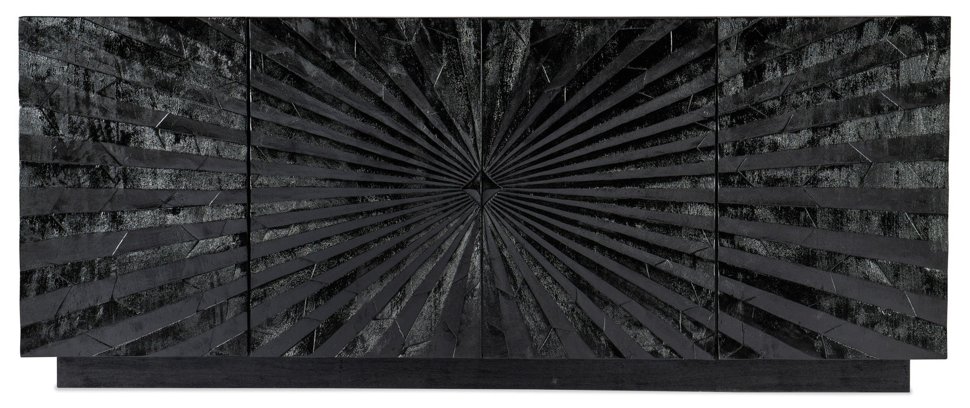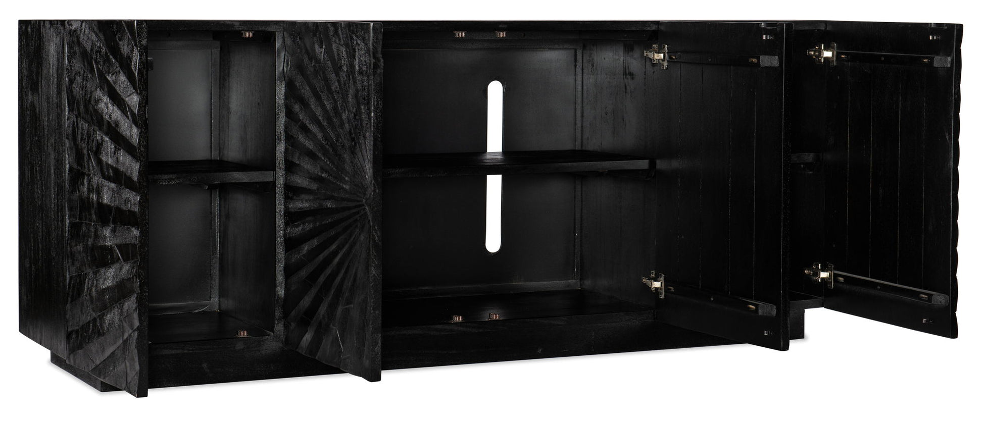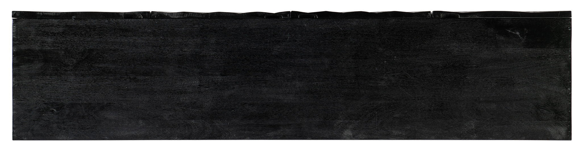 A tactile and intricate solid wood pattern highlights the Commerce & Market Entertainment Console, featured in a transparent black finish that reveals color and grain variances. Accommodating up to a 75-inch TV, there’s one removable wood shelf behind the center pair of doors and one removable wood shelf behind each of the left and right outside doors. Ventilated back panel.