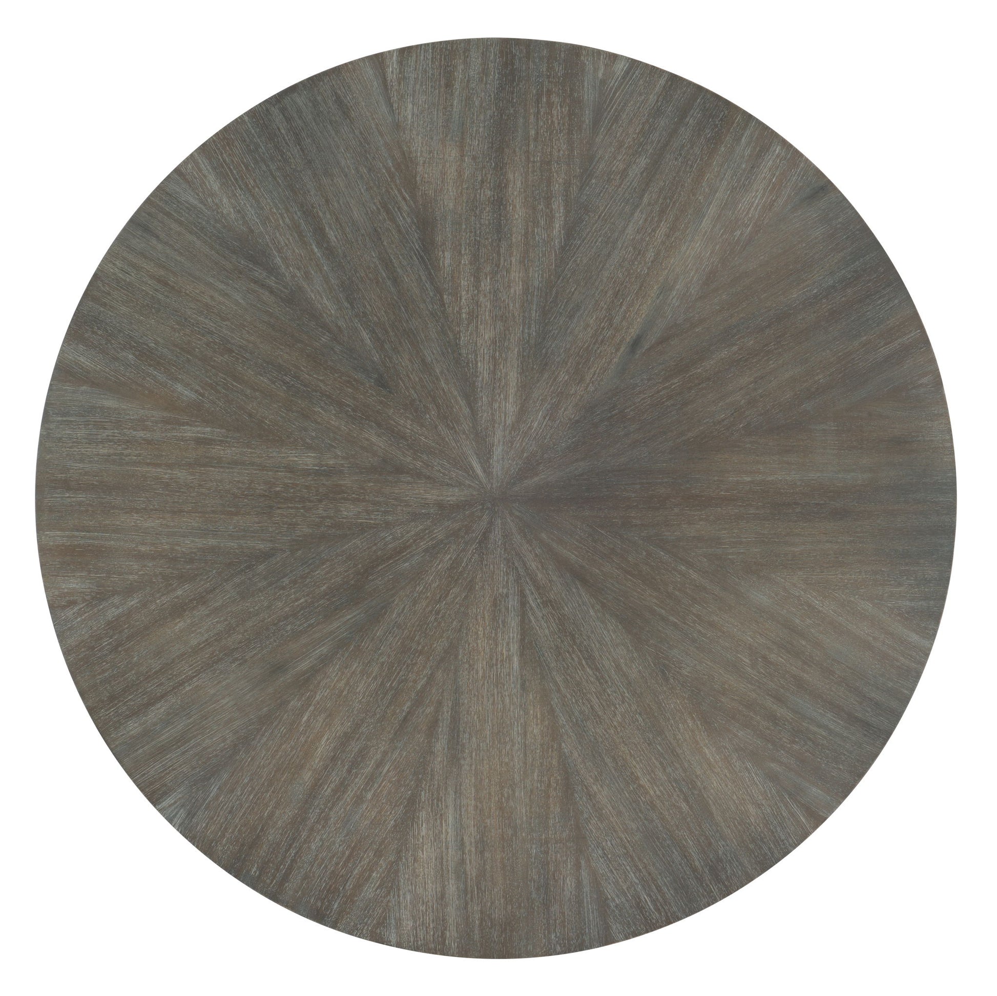 Beautifully scaled and intricately designed, this round table pairs a tabletop and bottom shelf crafted of Acacia Veneers with a starburst veneer pattern in a finish with a metal frame.