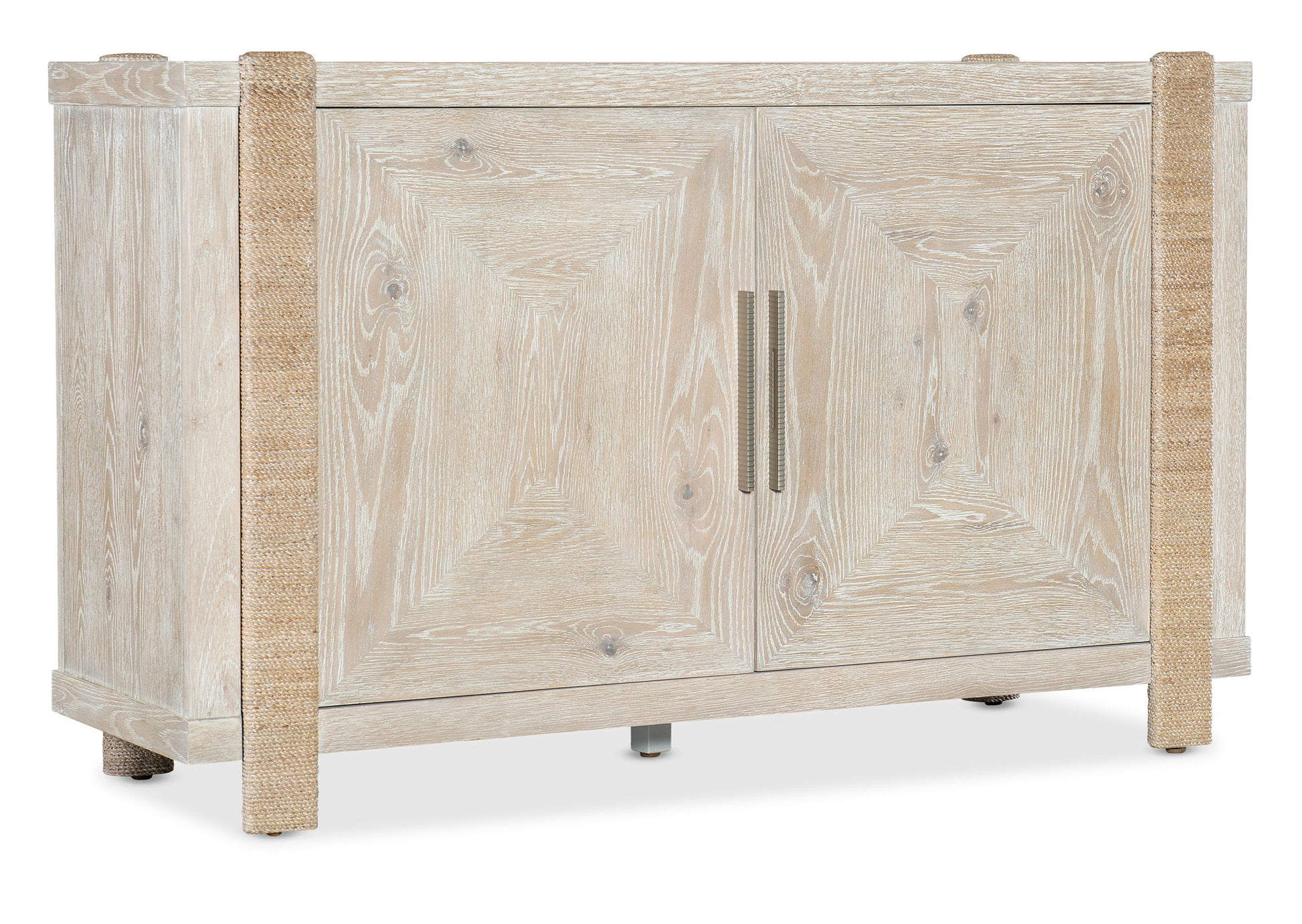 Bring the relaxation of the shore into your home with the Seaside Buffet. The versatile and functional piece is crafted of Oak Veneers in a natural light wood finish with rope-wrapped legs, and features a creamy white painted interior. The two wood doors with soft-close hinges have two adjustable shelves behind the doors.