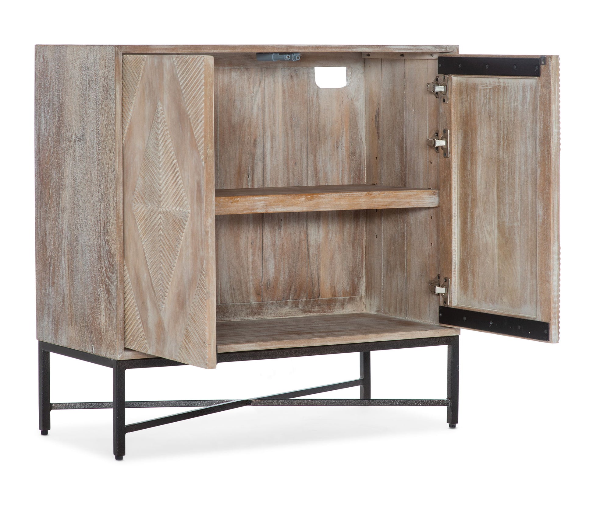 Offering a casual modern rustic design with a tribal flair, the Commerce & Market Two-Door Chest is crafted of Mango Solids and Iron with carved front doors with diamond motifs, There’s one adjustable wood shelf behind the doors and a metal base.